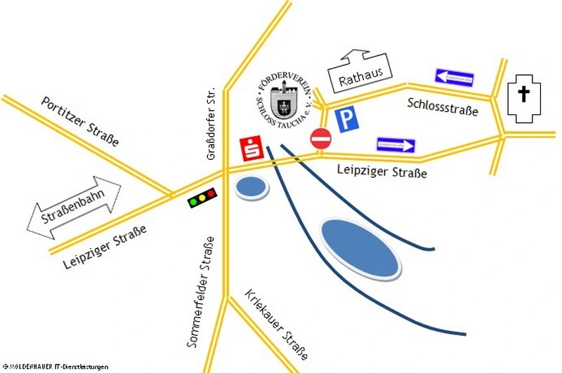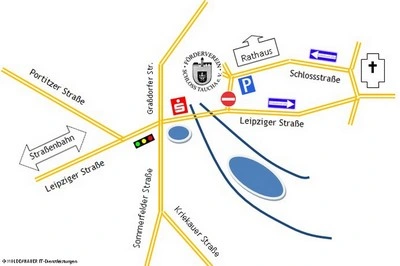 Sie laufen die Lindnerstraße in Richtung Kaufhaus Fischer und gehen rechts in die Portitzer Straße. Am Ende biegen Sie links auf die Leipziger Straße in Richtung INNENSTADT, überqueren die Ampelkreuzung, passieren auf der linken Seite die SPARKASSENFILIALE, überqueren die PARTHE, gehen an der Sackgasse An der Parthe vorbei, passieren links einige Läden und gehen bis zur Einmündung Schloßstraße. Diese laufen sie bergauf in Richtung RATHAUS. Nach ca. 100 m sehen Sie bereits linkerhand unseren historischen WEINBERG. Die nächste Einmündung ist bereits die Schlossauffahrt Haugwitzwinkel.