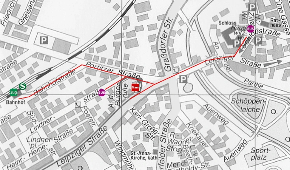 Verlassen Sie den Bahnhof nach links in die Bahnhofstraße. Am Ende der Straße lassen Sie die Schranken linksseitig liegen und gehen rechts in die Portitzer Straße. Sie laufen am Ende links auf die Leipziger Straße in Richtung INNENSTADT, queren die Ampelkreuzung, passieren auf der linken Seite die SPARKASSENFILIALE, überqueren die PARTHE, gehen an der Sackgasse An der Parthe vorbei, passieren links einige Läden und gehen bis zur Einmündung Schloßstraße. Diese laufen sie bergauf in Richtung RATHAUS. Nach ca. 100 m sehen Sie bereits linkerhand unseren historischen WEINBERG. Die nächste Einmündung ist bereits die Schlossauffahrt Haugwitzwinkel.