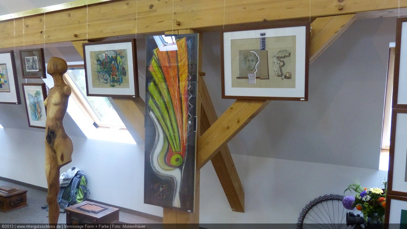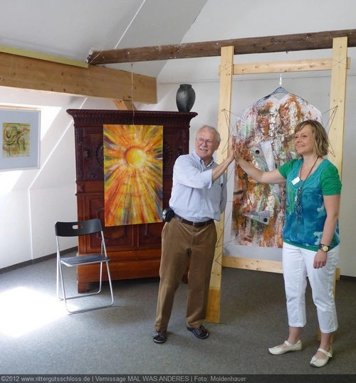 Die Eröffnungsvernissage am Freitagabend startete um 18 Uhr. Langsam füllte sich der riesige Raum der „Kulturscheune“ des alten Ritterguts mit den ersten geladenen Gästen. Das Ambiente war sehr stimmungsvoll und sowohl das Buffet, mit so mancher Leckerei bestückt, als auch die Bilder von Michael Schreckenberger waren ein Genuss.