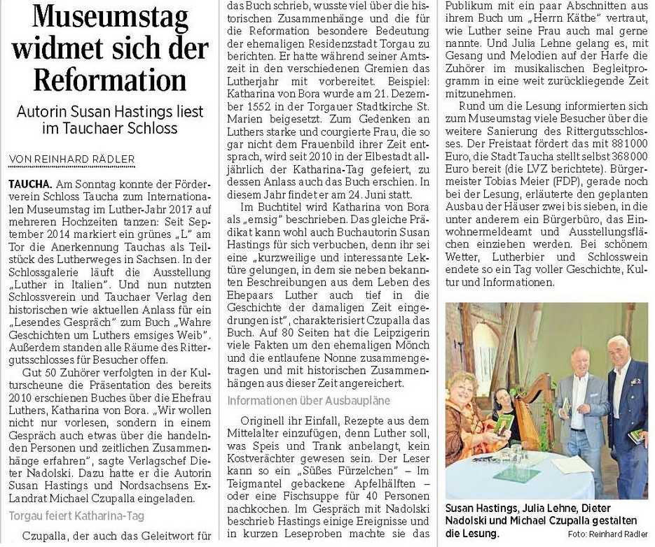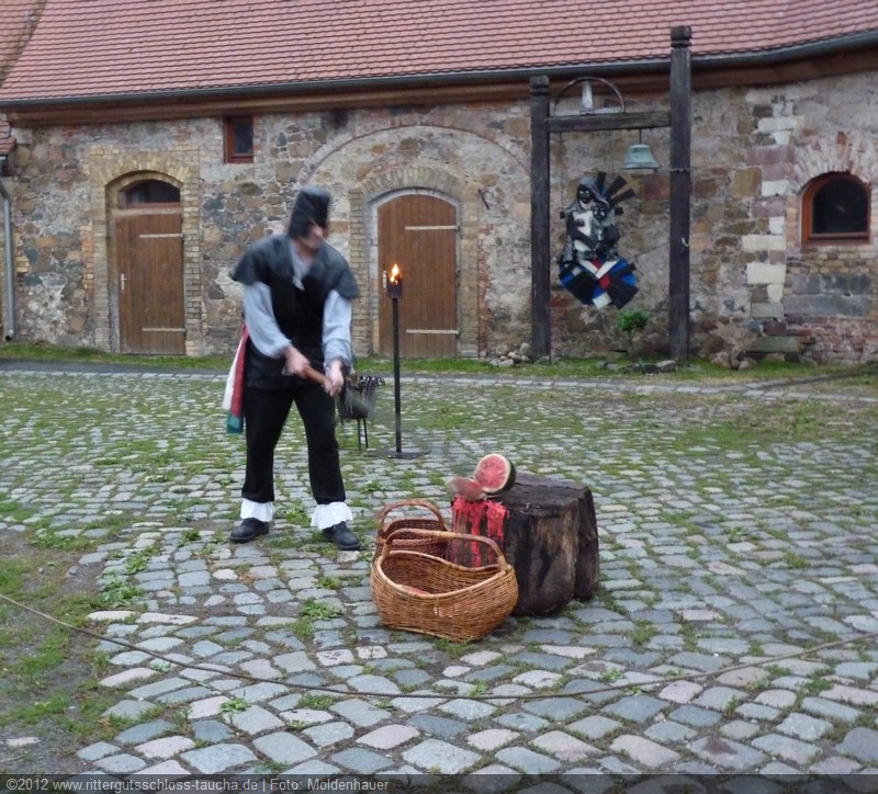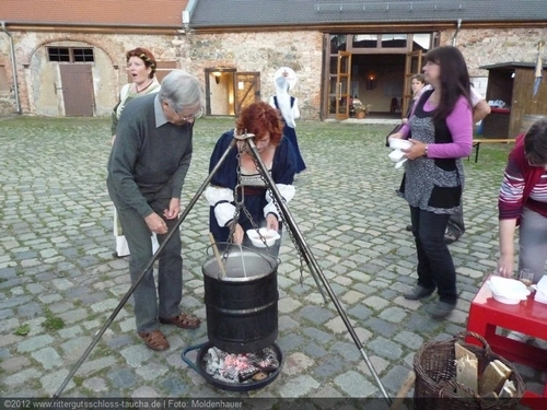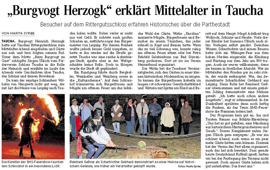 Ein abschließender Dank gilt den Mitgliedern des Fördervereins Schloss Taucha e. V., die uns wesentlich mit unterstützt haben und mit großem Engagement vollständig kostümiert als Burgherr, Burgfräulein und Burgwirt den Abend mit begleitet haben. Ein Teil des Erlöses aus dem Kartenverkauf geht als Spende an diesen Förderverein.