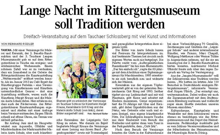 Die erste Veranstaltung unter dem Motto „Kunst mit Genuss“ fand vom 09.09.11 – 13.09.11 im Rittergut in Taucha statt. Bestaunen konnte man aufwändig gestaltete Gemälde und Skulpturen des Künstlers Michael Schreckenberger (Atelier Nord).