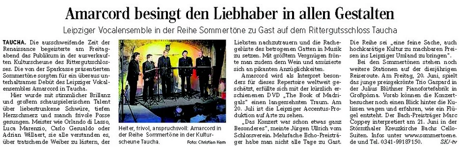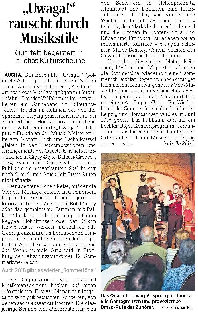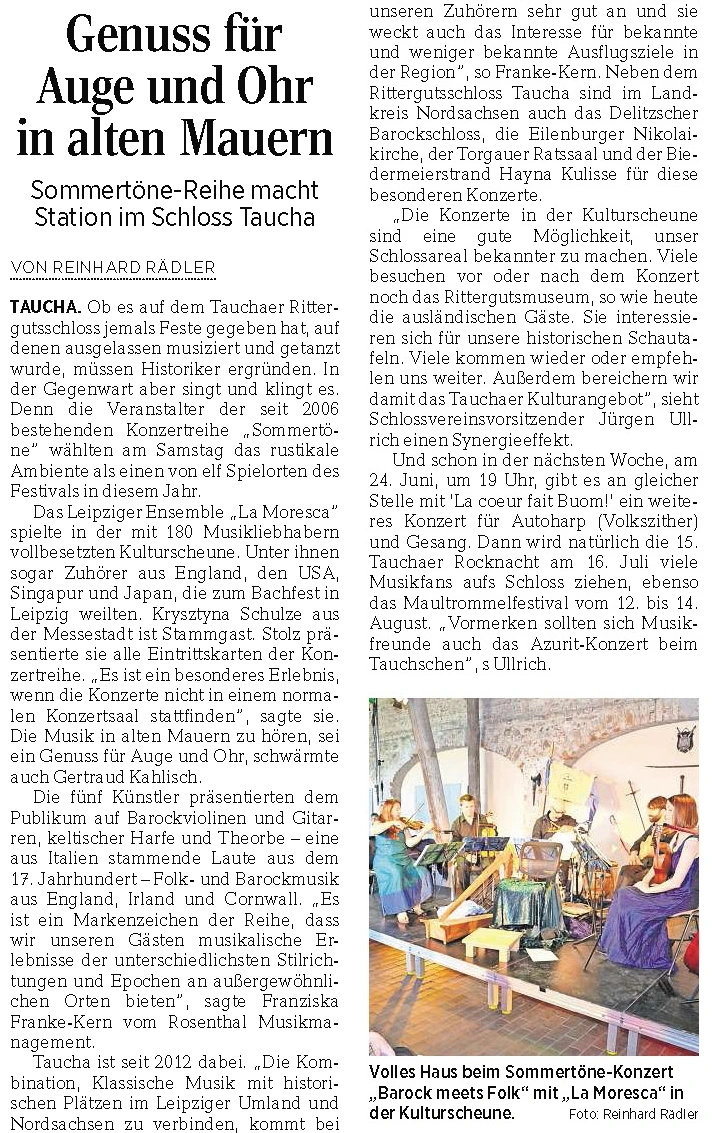 Dass so viele Musikliebhaber aus der näheren Umgebung gekommen sind, ist ein gutes Zeichen für die erfolgreiche Zusammenarbeit mit dem Förderverein Schloss Taucha e. V., dem Erlebten aus dem Vorjahreskonzert und dem aktiven Werben in diesem Jahr. Bereits nach dem zweiten Mal in Folge scheint das Sommerkonzert zum festen Bestandteil der sommerlichen Veranstaltungsreihe im Rittergutsschloss zu gehören.