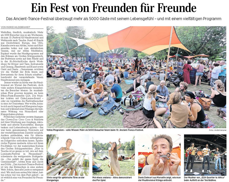 Hatte man am Donnerstag noch den Eindruck: „Na, hier müssen die Organisatoren aber noch einen Zahn zulegen!“, war zur Eröffnung der Festivaltage in Taucha alles auf den Punkt. Lediglich ein paar Fähnchen mussten noch befestigt werden. Das 4. Maultrommel- und Weltmusikfestival „Ancient Trance“ 2011 in Taucha konnte beginnen.