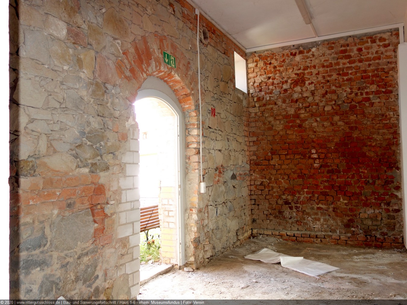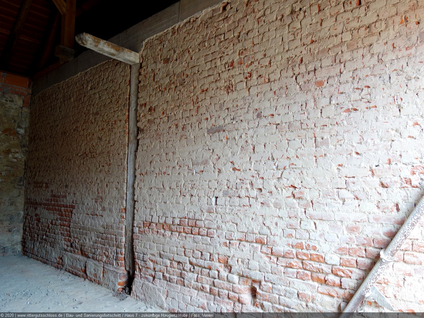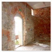 Diesmal wurde ein Wandabschnitt, bestehend aus einer Mauermischung von Naturstein und gebrannten Ziegeln saniert. Die Wand wurde zuerst sandgestrahlt, nachdem ein aufwändiger Spritzschutz errichtet worden war, um den restlichen Raum weitgehend vor Dreck und Staub zu schützen. Nach dem Sandstrahlen wurden das gegebene Fugenwerk tiefengrundiert und anschließend per Hand neu verfugt.