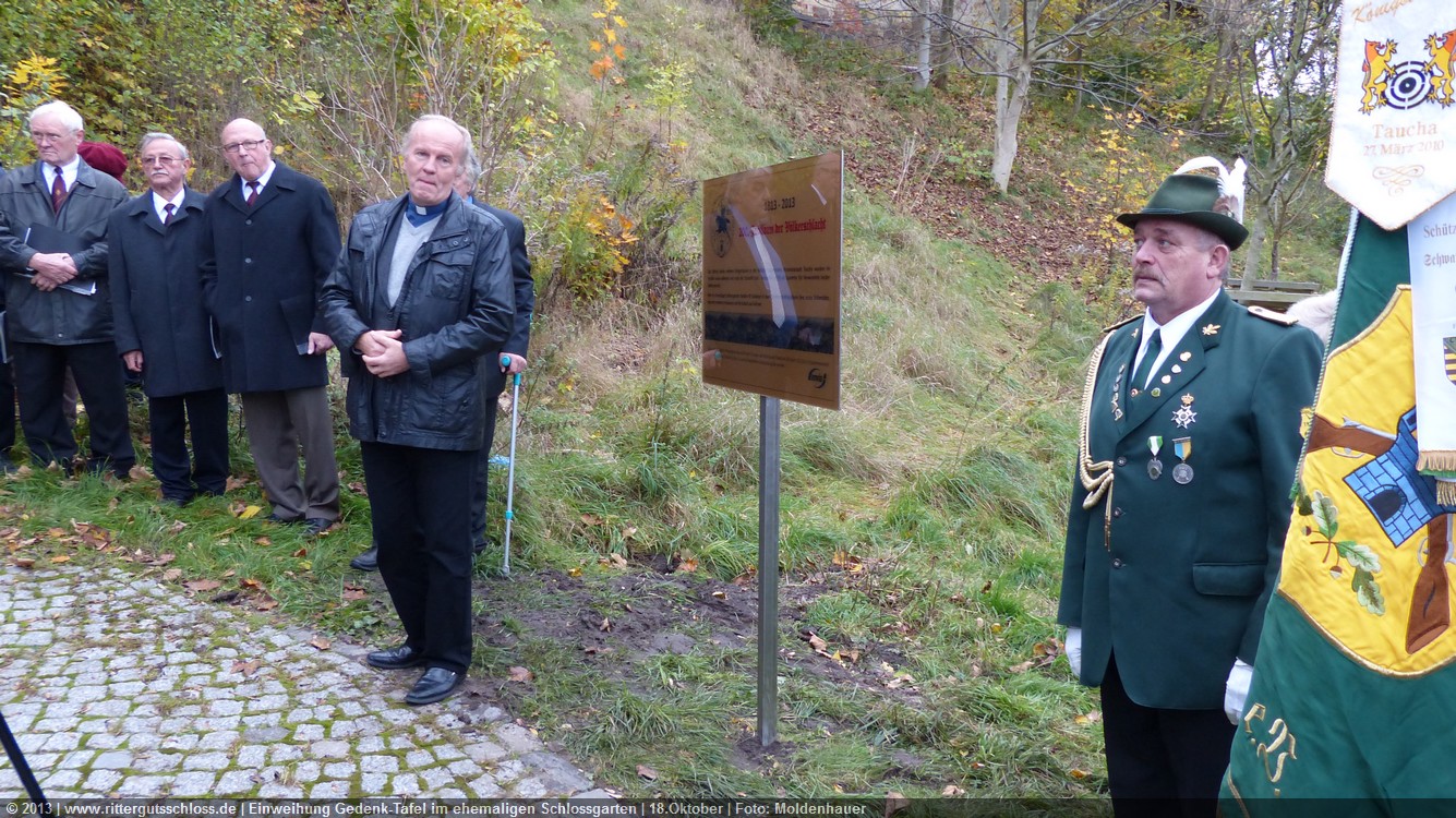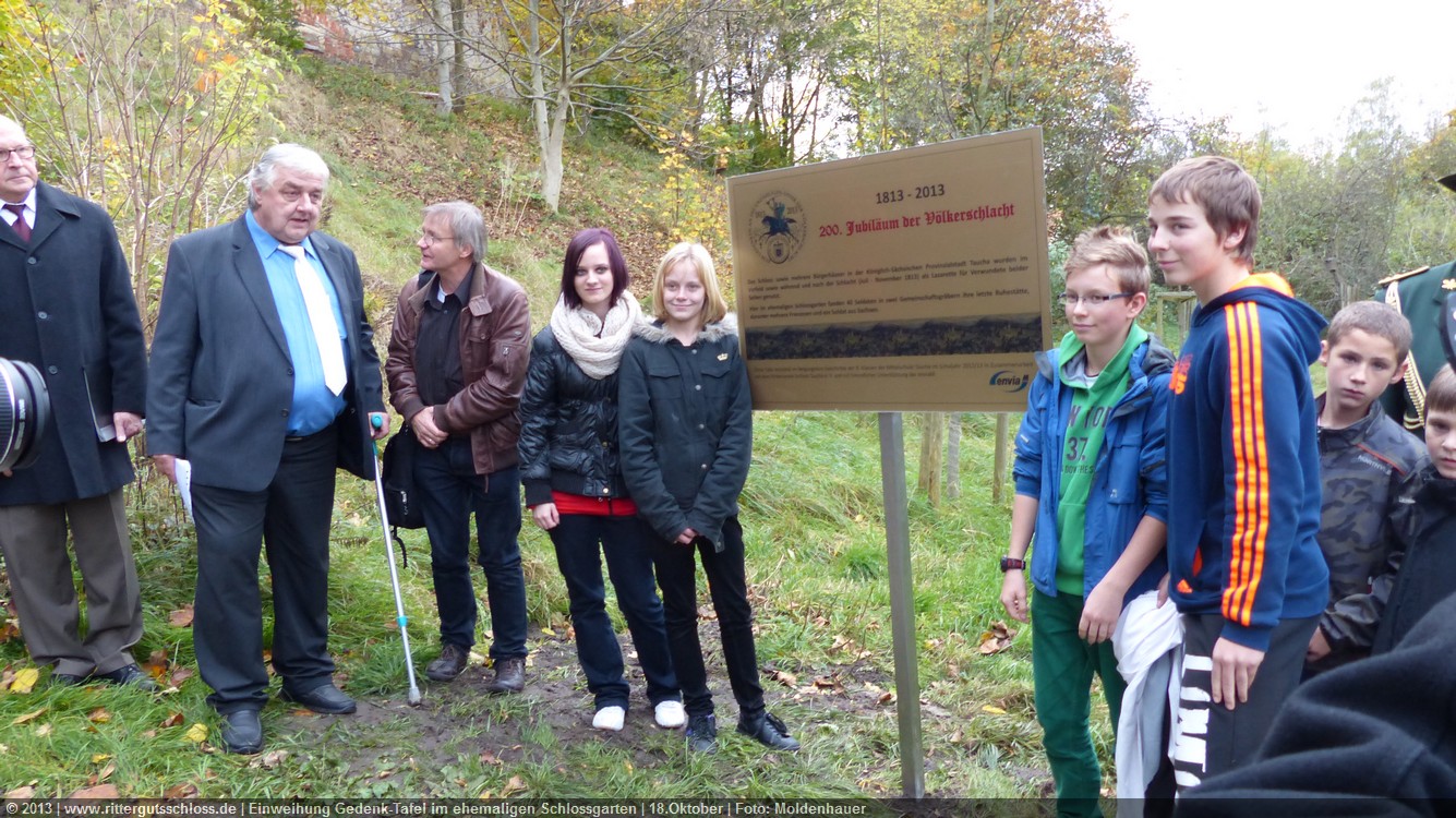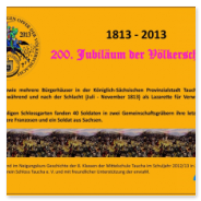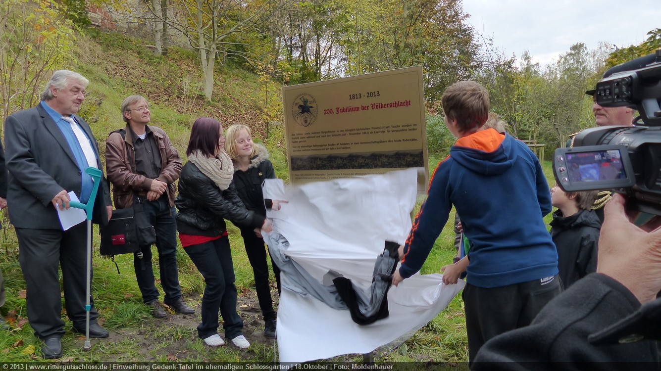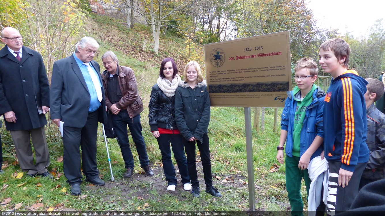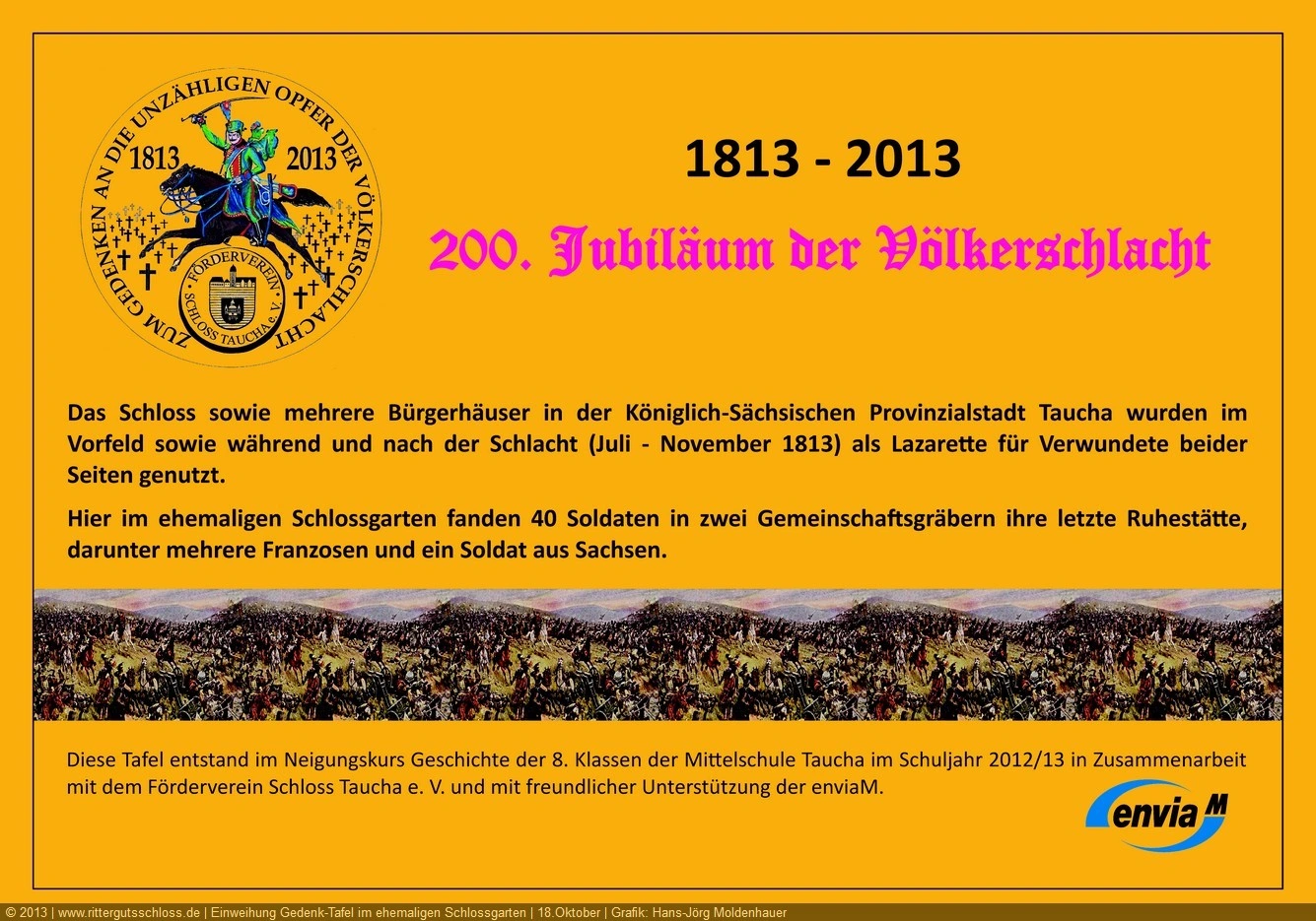 Zum 200. Jahrestag der Völkerschlacht bei Leipzig, die auch die Parthestadt nachhaltig berührte, gedachte Taucha mit einem großen feierlichen Akt am Freitagabend der Opfer. Um 16:30 Uhr wurde am ehemaligen Schlossgarten (heutige Streuobstwiese am Schlossberg) eine Erinnerungstafel eingeweiht. Die Erinnerungstafel entstand im Rahmen eines Forschungsprojektes des Neigungskurses Geschichte der Klassenstufe 8 der Oberschule Taucha in Zusammenarbeit mit dem Förderverein Schloss Taucha e. V. und mit freundlicher Unterstützung von enviaM. Die beteiligten Schüler setzten mit der Enthüllung der Tafel praktisch den Schlusspunkt unter ihre Projektarbeit.