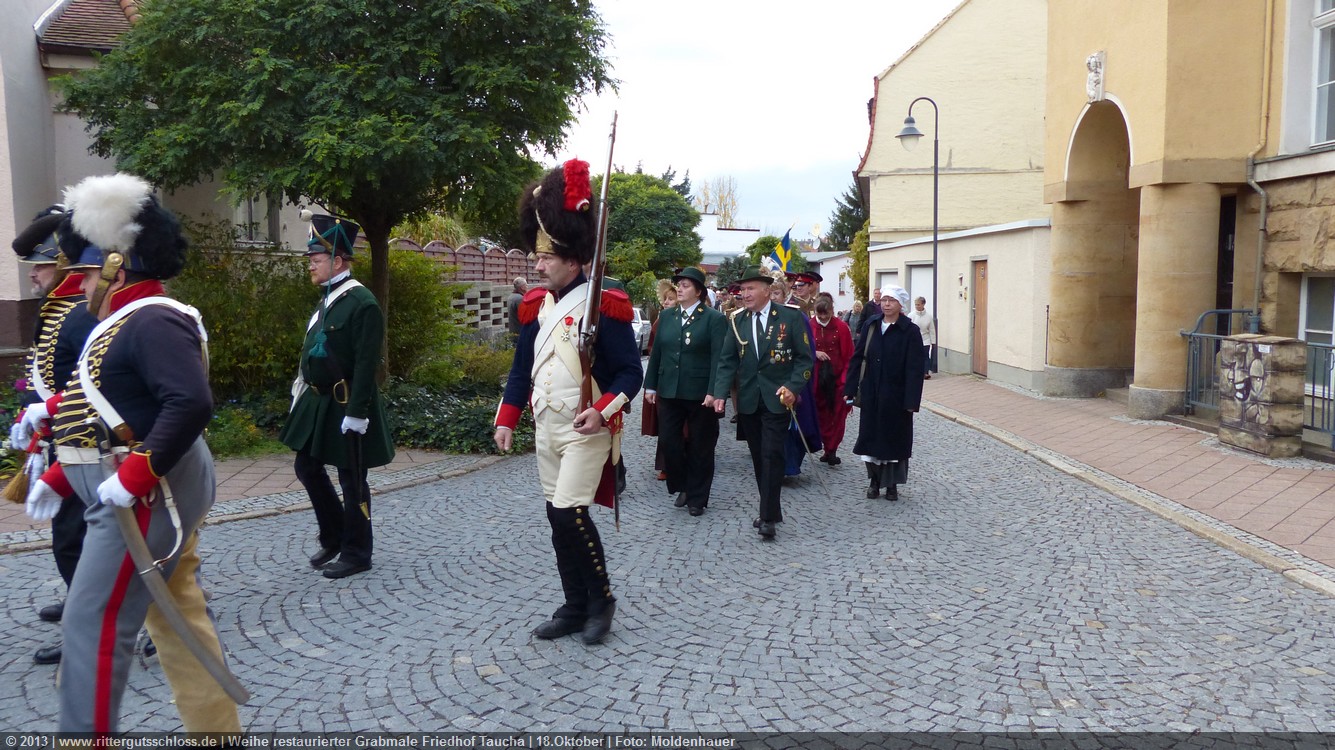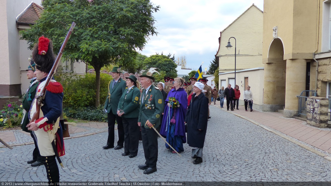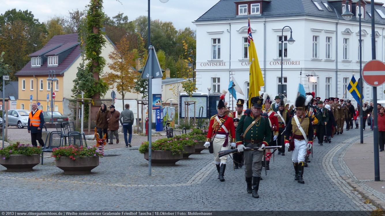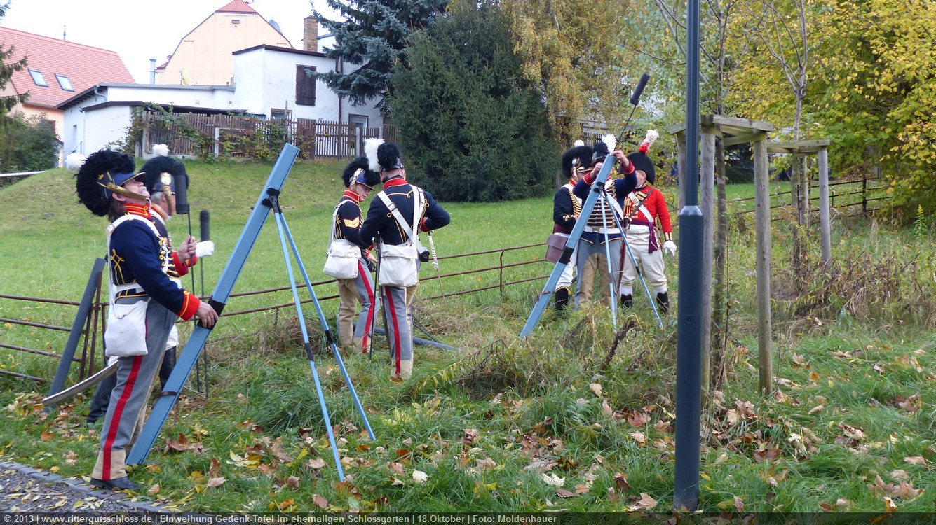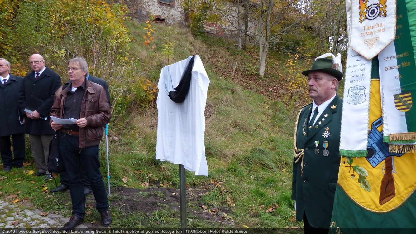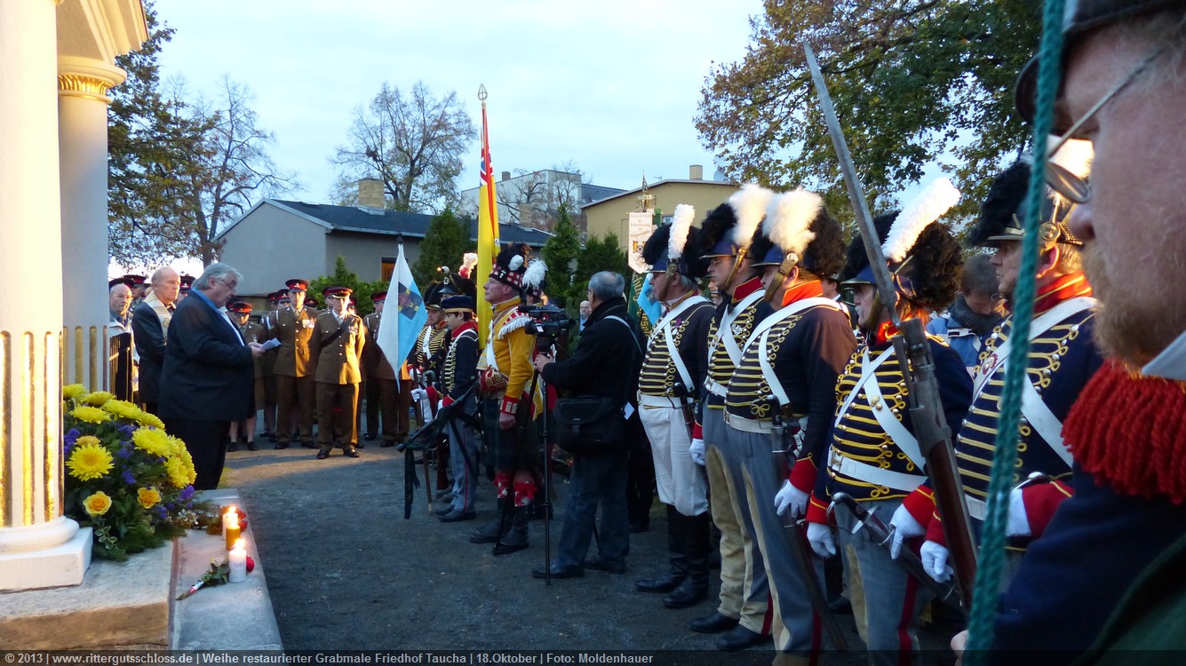 Zum 200. Jahrestag der Völkerschlacht bei Leipzig, die auch die Parthestadt nachhaltig berührte, gedachte Taucha mit einem großen feierlichen Akt am Freitagabend der Opfer. Um 16:30 Uhr wurde am ehemaligen Schlossgarten (heutige Streuobstwiese am Schlossberg) eine Erinnerungstafel eingeweiht. Die Erinnerungstafel entstand im Rahmen eines Forschungsprojektes des Neigungskurses Geschichte der Klassenstufe 8 der Oberschule Taucha in Zusammenarbeit mit dem Förderverein Schloss Taucha e. V. und mit freundlicher Unterstützung von enviaM. Die beteiligten Schüler setzten mit der Enthüllung der Tafel praktisch den Schlusspunkt unter ihre Projektarbeit.