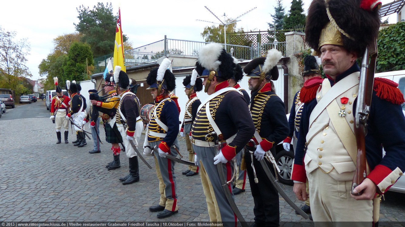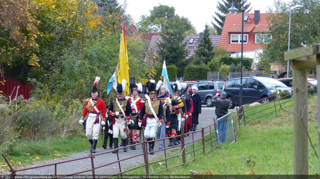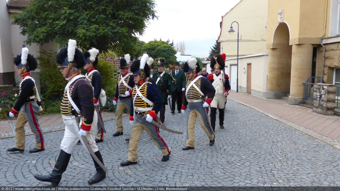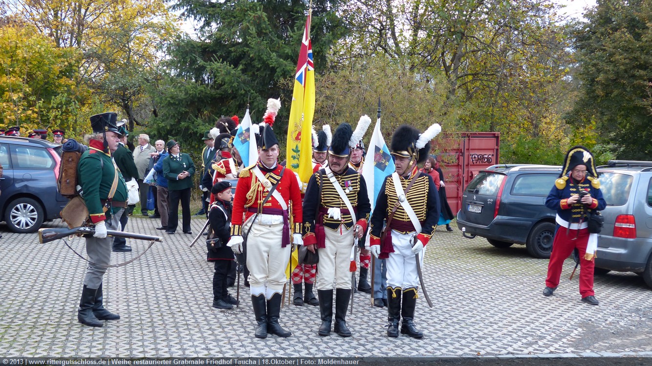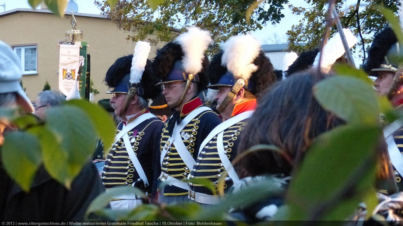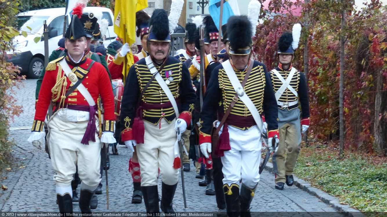 Zum 200. Jahrestag der Völkerschlacht bei Leipzig, die auch die Parthestadt nachhaltig berührte, gedachte Taucha mit einem großen feierlichen Akt am Freitagabend der Opfer. Um 16:30 Uhr wurde am ehemaligen Schlossgarten (heutige Streuobstwiese am Schlossberg) eine Erinnerungstafel eingeweiht. Die Erinnerungstafel entstand im Rahmen eines Forschungsprojektes des Neigungskurses Geschichte der Klassenstufe 8 der Oberschule Taucha in Zusammenarbeit mit dem Förderverein Schloss Taucha e. V. und mit freundlicher Unterstützung von enviaM. Die beteiligten Schüler setzten mit der Enthüllung der Tafel praktisch den Schlusspunkt unter ihre Projektarbeit.