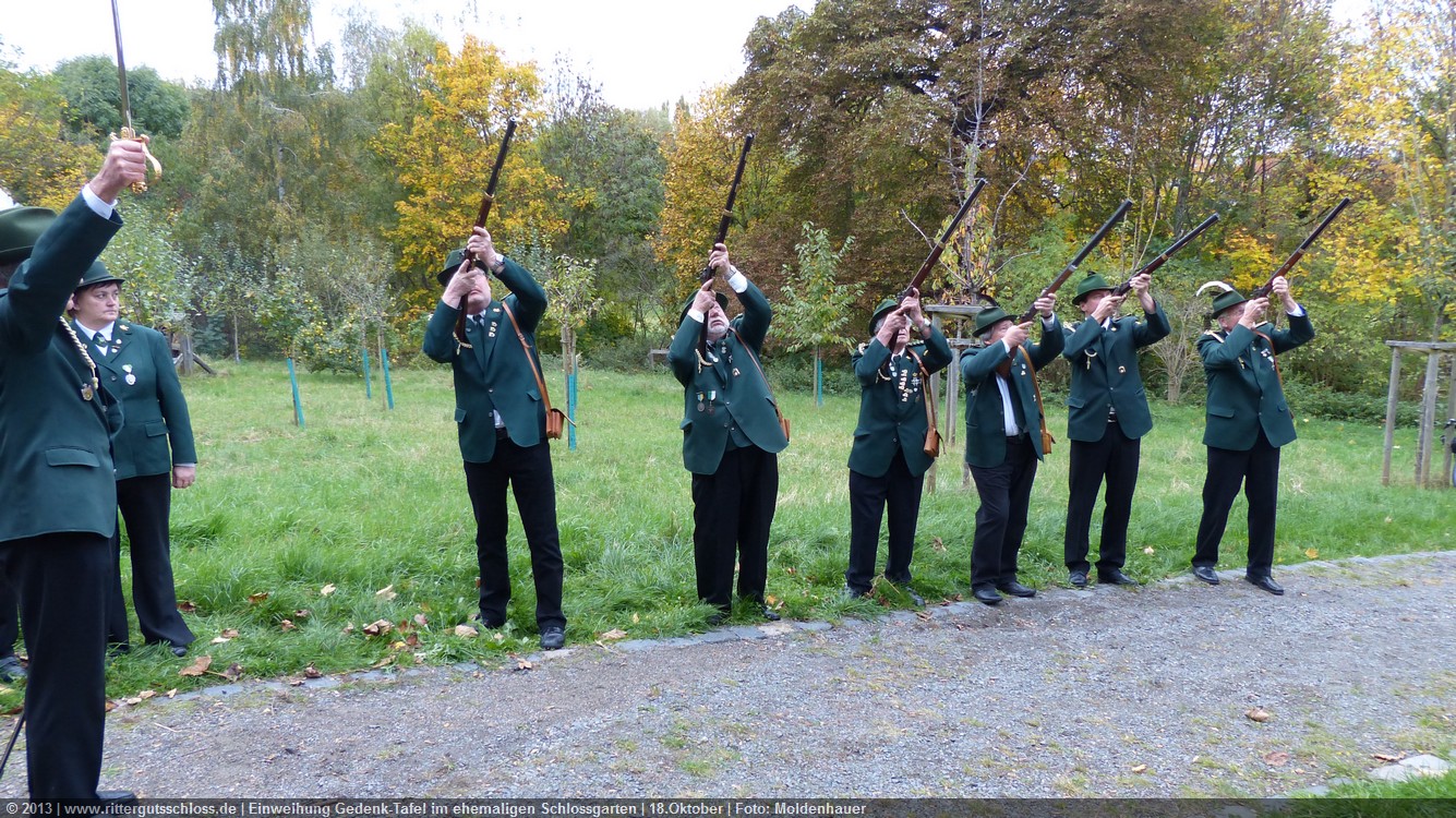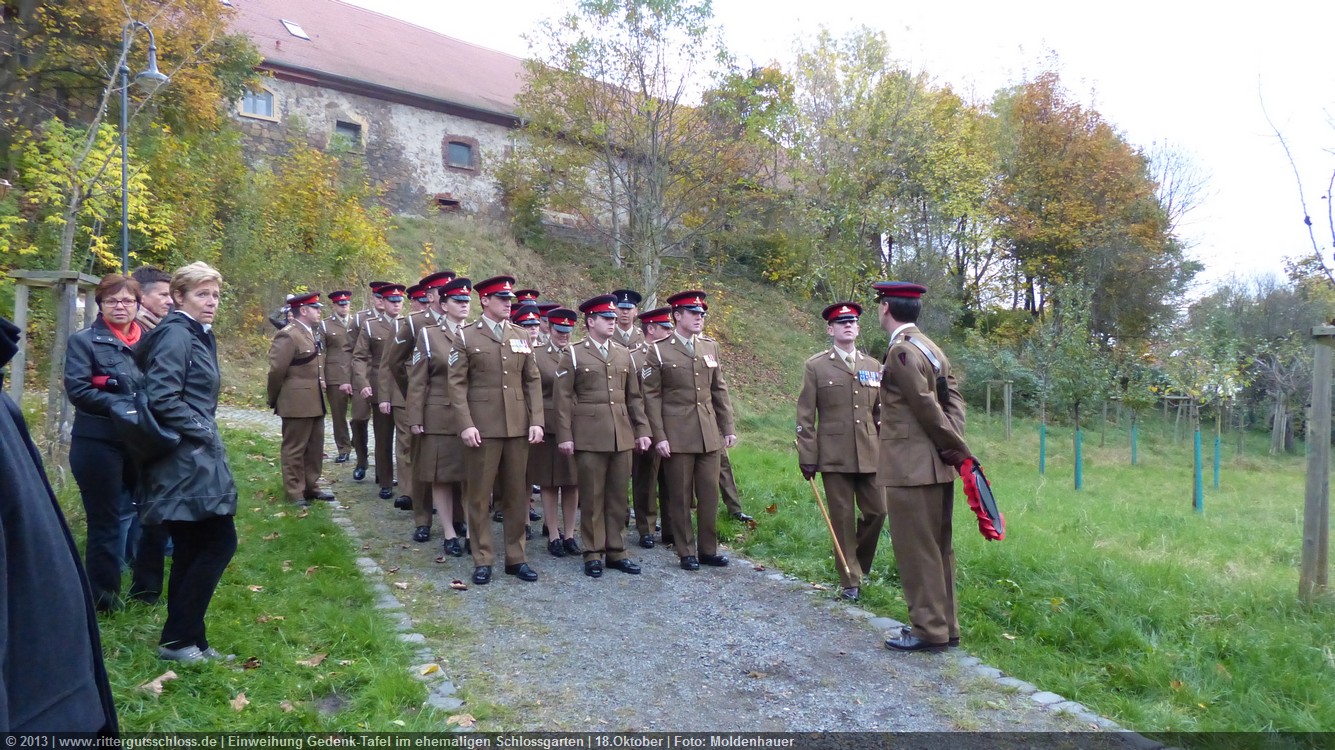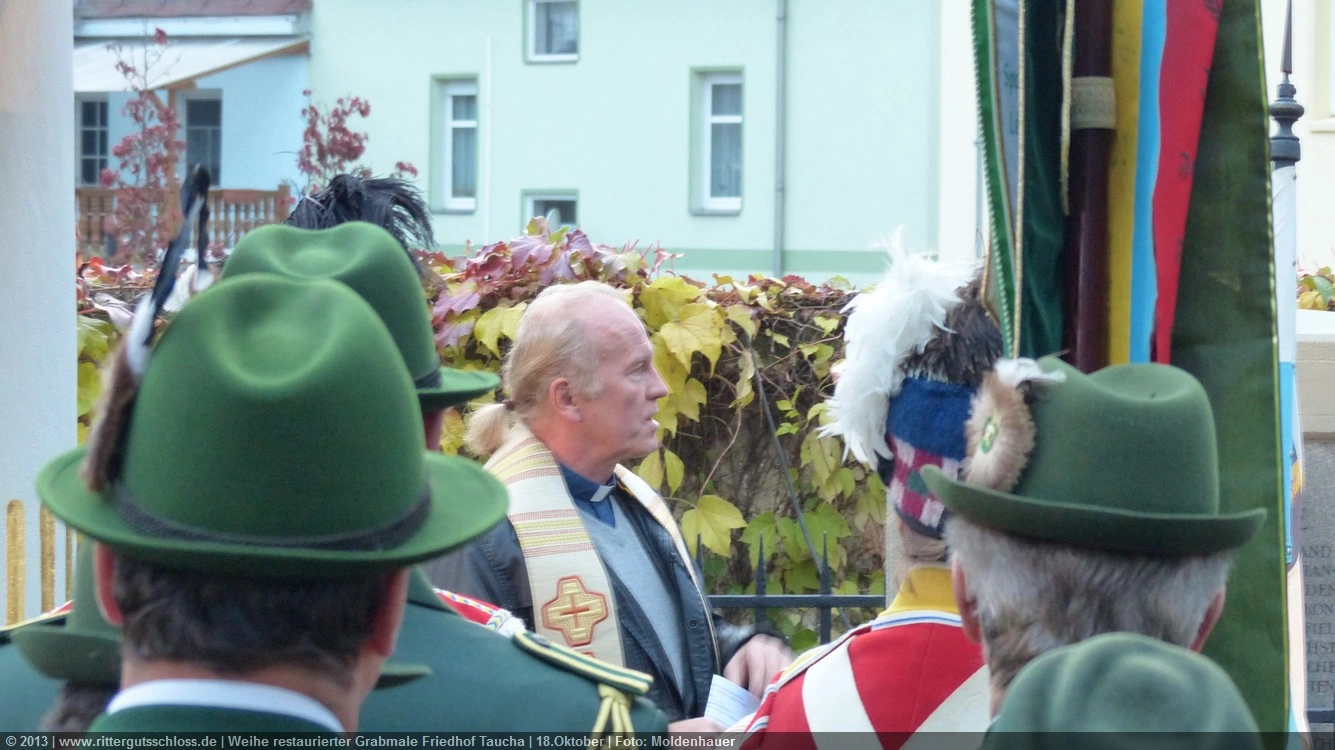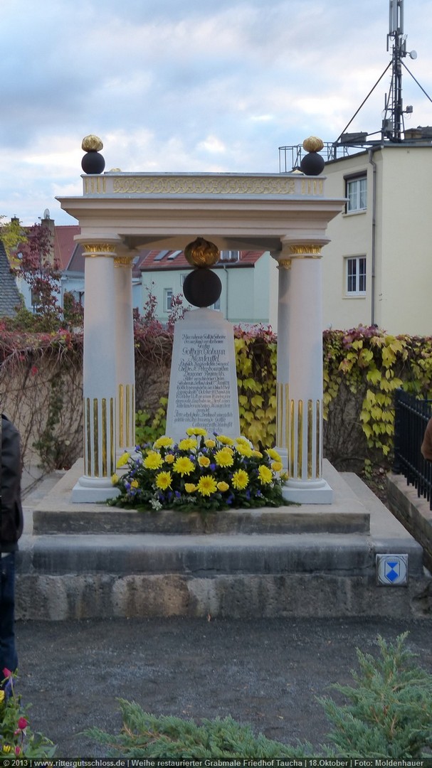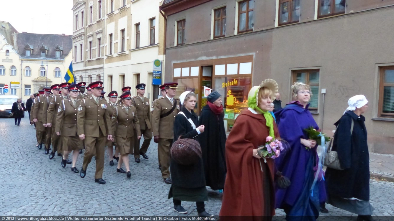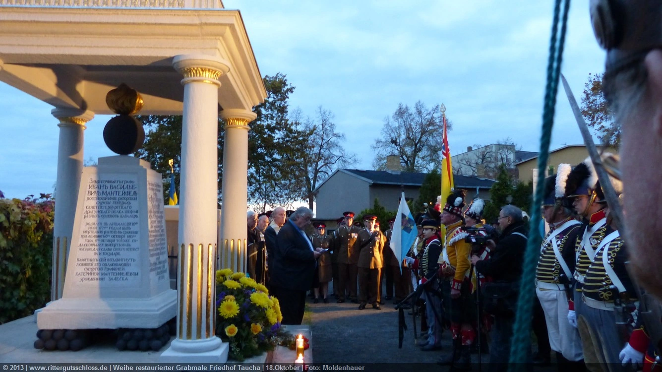 Zum 200. Jahrestag der Völkerschlacht bei Leipzig, die auch die Parthestadt nachhaltig berührte, gedachte Taucha mit einem großen feierlichen Akt am Freitagabend der Opfer. Um 16:30 Uhr wurde am ehemaligen Schlossgarten (heutige Streuobstwiese am Schlossberg) eine Erinnerungstafel eingeweiht. Die Erinnerungstafel entstand im Rahmen eines Forschungsprojektes des Neigungskurses Geschichte der Klassenstufe 8 der Oberschule Taucha in Zusammenarbeit mit dem Förderverein Schloss Taucha e. V. und mit freundlicher Unterstützung von enviaM. Die beteiligten Schüler setzten mit der Enthüllung der Tafel praktisch den Schlusspunkt unter ihre Projektarbeit.