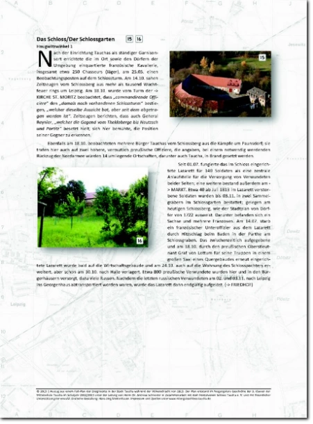 Alle Angaben basieren auf dem Basiswerk von Detlef Porzig: „Die Chronik von Taucha“, Taucha 2012; Helmut Köhler / Detlef Porzig, „Spaziergang durch Taucha“; Taucha 1999; den beiden genannten Augenzeugenberichten sowie zeitgenössischen Veröffentlichungen, denen auch die Zitate entnommen wurden, u. a. Moritz Janj: Denkwürdigkeiten der großen Völker- und Befreiungs-Schlacht bei Leipzig, Leipzig 1846; Franz Sommer: Die Völkerschlacht bei Leipzig im Jahre 1813, Leipzig 1847; Heinrich Wuttke, Die Völkerschlacht bei Leipzig, Berlin 1863; Theodor Apel: Tabellarische Zusammenstellung der Kriegsereigniße bey Leipzig im October 1813, Leipzig 1866; Paul Benndorf: Die Völkerschlacht bei Leipzig. Ein Gedenkbuch für die hundertjährige Jubelfeier, Leipzig, 4. Auflage 1913. | Stadtplan Taucha: Mit freundlicher Genehmigung des Städte-Verlag E. v. Wagner & J. Mitterhuber GmbH, 70736 Fellbach, | Historische Schlachtpläne: wikipedia.de, google.de, Lizenzfrei; Ursprünge: Brockhaus‘ Konversations-Lexikon, 14. Auflage, 1892 - 1895. und Meyers Großes Konversations-Lexikon, Band 12. Leipzig 1908.