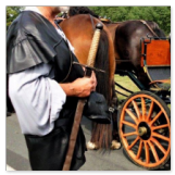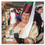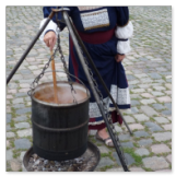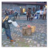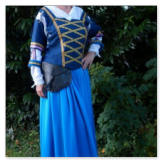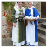 Hier möchte ich Ihnen die Marktfrau Adelheid vorstellen. Ihr Gewand stammt aus dem 16. Jahrhundert. Der Rock besteht ist zweigeteilt - ein brauner unterer Rock und ein beigefarbener Überrock, der seitlich offen und zur Seite gerafft werden kann. Das Material ist Wolle, ebenso der wärmespendende Umhang mir Kapuze. Am Gürtel hängt ein Gürtelbeutel aus rotem Samt. Das Oberteil wurde aus Leinen gefertigt. Das Vorderteil ziert eine Schnürung, die mit rotem Samt unterlegt wurde. Die Ärmel sind angenestelt (durch Schnüre abnehmbar). Als Kopfbedeckung trägt unsere Marktfrau wahlweise ein gebundenes Tuch oder eine Kappe.