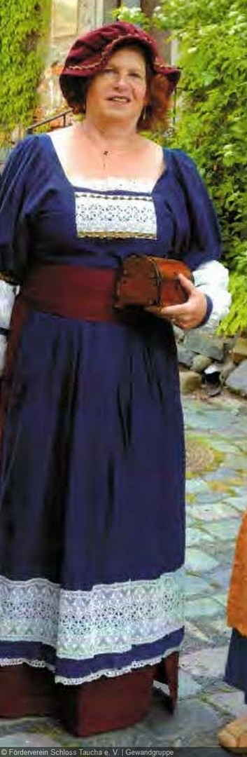 Dafür besitzt unser Vereinsmitglied Claudia Staats nun ein Gewand, in welchem sie die Kaufmannsfrau Johanna Sophia darstellt. Dieses Gewand ist etwa in das 15. Jahrhundert einzuordnen. Zu dieser Zeit verwendete man in der Regel Leinen, Hanf und Wolle. Auch die Kleidung des Adels wurde aus diesen Materialien gefertigt, unterschied sich jedoch durch die Stoffqualität. Im frühen Mittelalter hatten die Kleider noch keinen richtigen „Schnitt“, da die Breite des Kleides durch die Breite des Webstuhles bestimmt wurde. Erst im 12. Jahrhundert wurden die Kleider nach Schnitten und Maßen gefertigt, die dann eine körperbetonte Mode zuließ.
