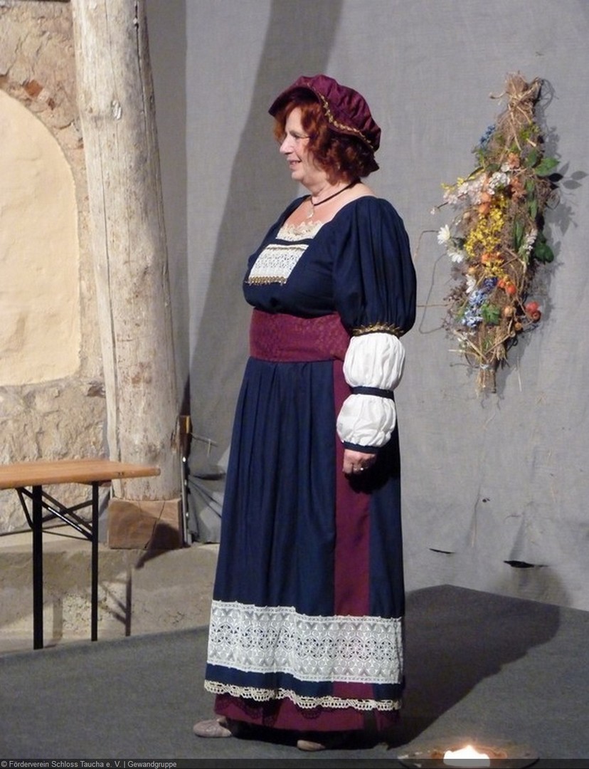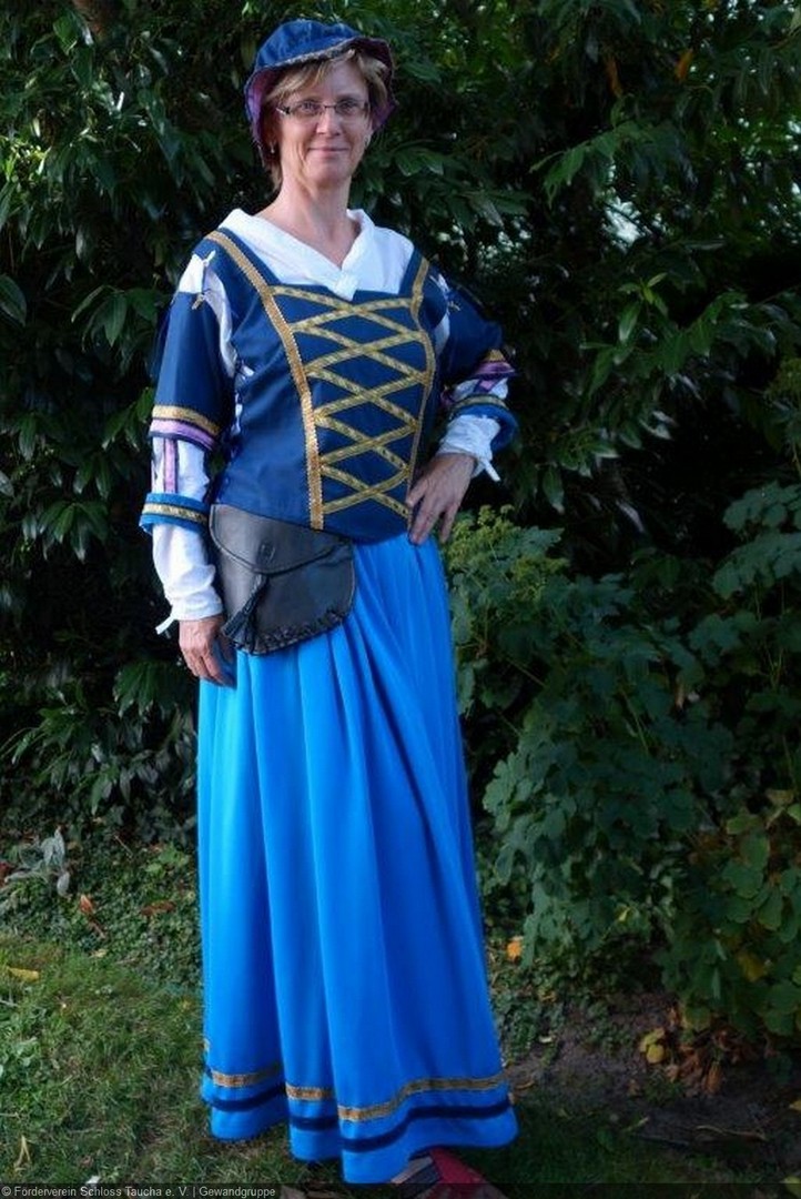 Die Bürgersfrau Viktoria trägt ein langes Hängekleid in Blau mit roten Einsätzen und weißem Spitzenbesatz. Die weißen gepufferten langen Ärmel verleihen dem Kleid ein durchaus festliches Aussehen. Ein rotes Miederteil ergänzt das Ambiente. Unter dem Oberkleid trug man ein Untergewand, Cotte genannt, von einfachem Schnitt, welches zugleich auch als Schlafgewand genutzt wurde.