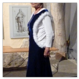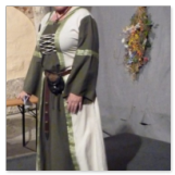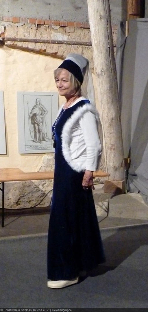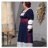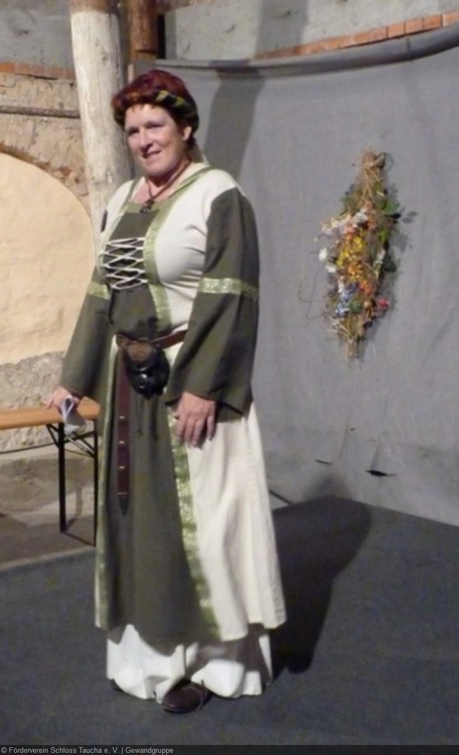Das sehr schöne Gewand einer Adligen zeigt uns Frau Erika Wulf. Getragen wurde diese aufwändige Kleidung im 14. und 15. Jahrhundert vorwiegend in Adelskreisen. Die Gewandung trug den Namen Surcot, was in der Übersetzung aus dem Französischen so viel bedeutet wie „über der Cotte, dem Unterkleid tragen“ (sur cotte).