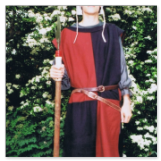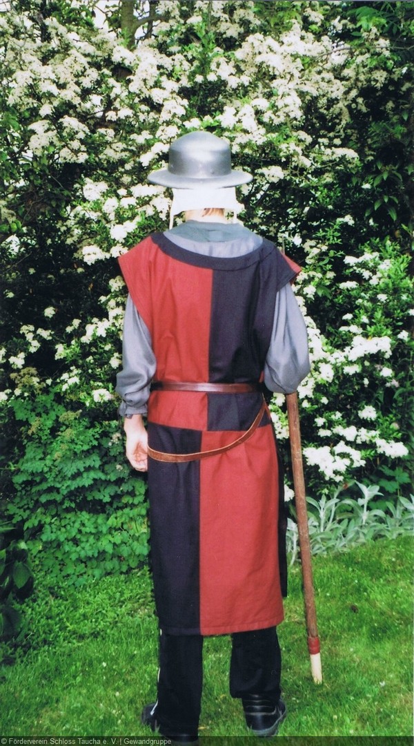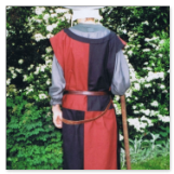Die zweite Tunika ist in Mi-Parti (gegeneinander gesetzte Farben) gearbeitet, eine Verarbeitungsart, die ab dem 14. Jahrhundert verbreitet war. Die Länge der Obergewänder variierte. Unter dem Obergewand trugen die Herren ein Hemd - die Cotte -, bei Notwendigkeit auch das Kettenhemd.