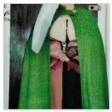 Sie trägt ein Kleid, welches in grün/beige gehalten und durch Bordüren geziert ist. Bemerkenswert an diesem Kleid sind die Kapuze und die Trompetenärmel. Im Vorderteil als auch im Rückenteil wurden sehr schöne Schnürungen eingearbeitet.