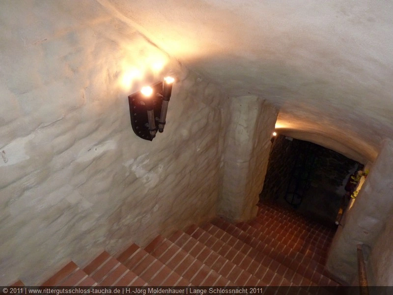 Unser Weg führt uns über eine lange steinerne Treppe ca. 8 Meter unter die Oberfläche. Hier präsentiert sich uns ein herrliches Tonnengewölbe im Urzustand seiner Erschaffung aus dem Originalsteinwerk. Nach der Entdeckung des Gewölbes wurde der gesamte Raum in mühevoller Arbeit von 20 Personen des Fördervereines und ABM-Kräften von mehreren Tonnen Schutt, Sand und Geröll befreit.