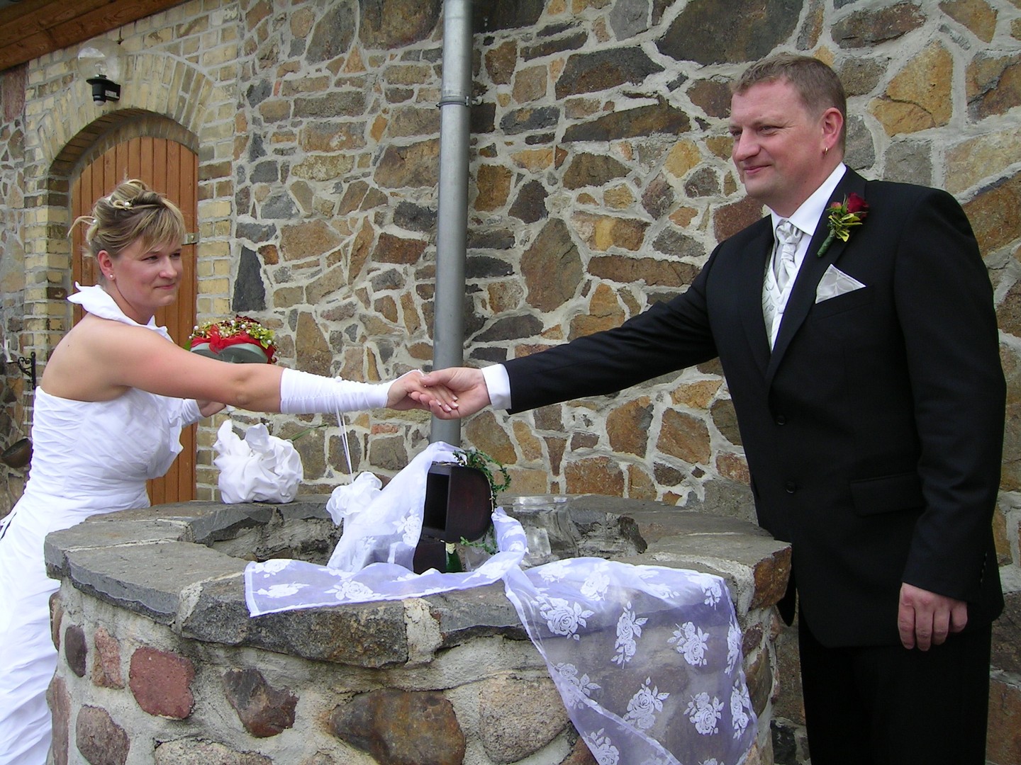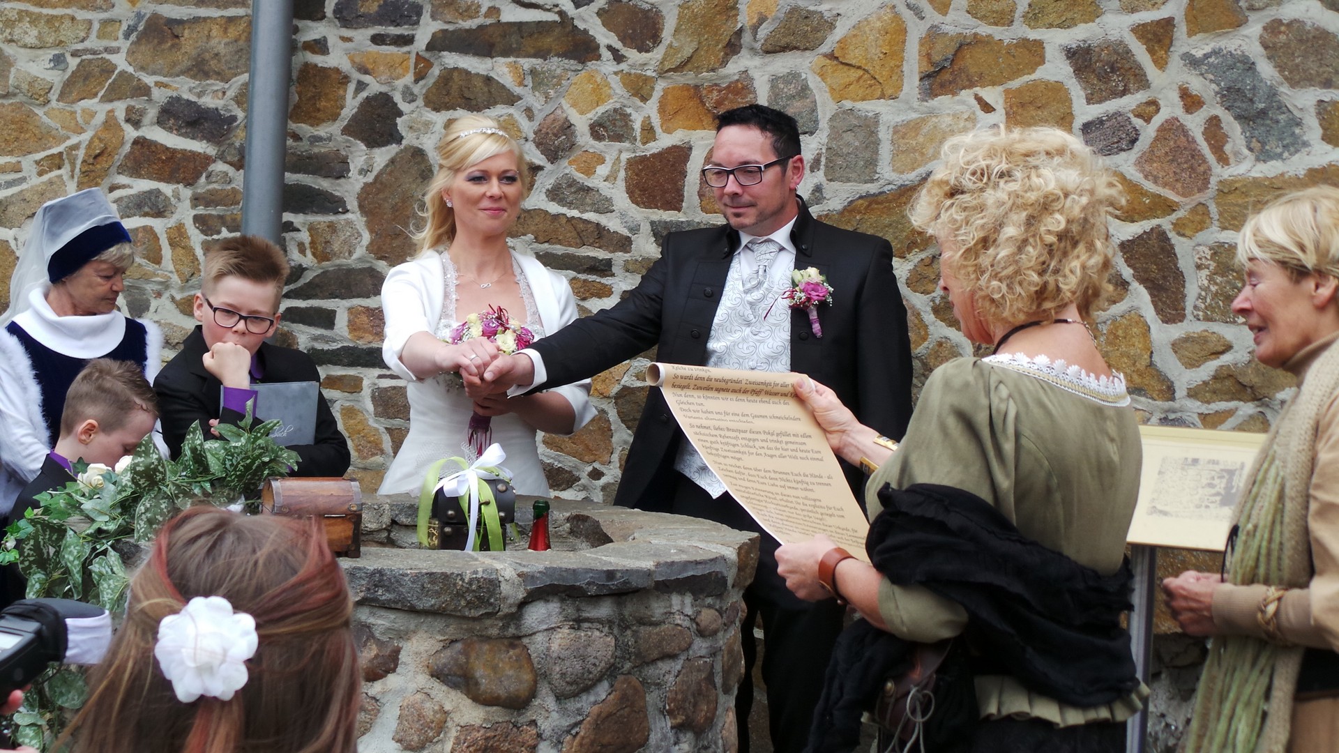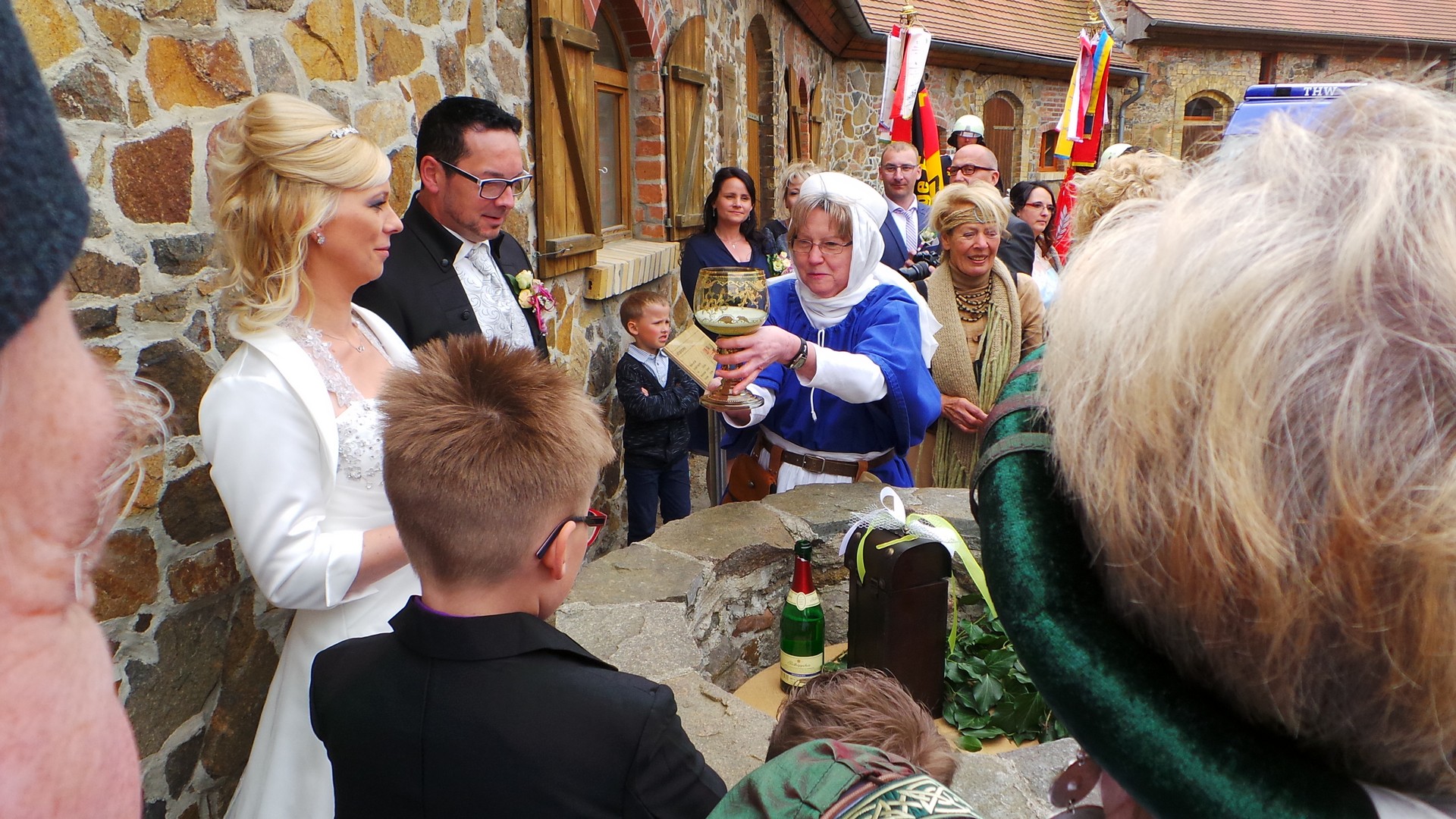 - Aus dem Schlossbrunnen wird 1 Flasche Sekt (wahlweise Wein) nach oben gezogen. Das Brautpaar trinkt nacheinander über den Brunnen hinweg aus einem gemeinsamen großen Kelch als Zeichen der Verbundenheit.