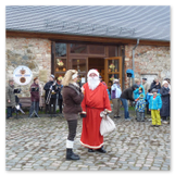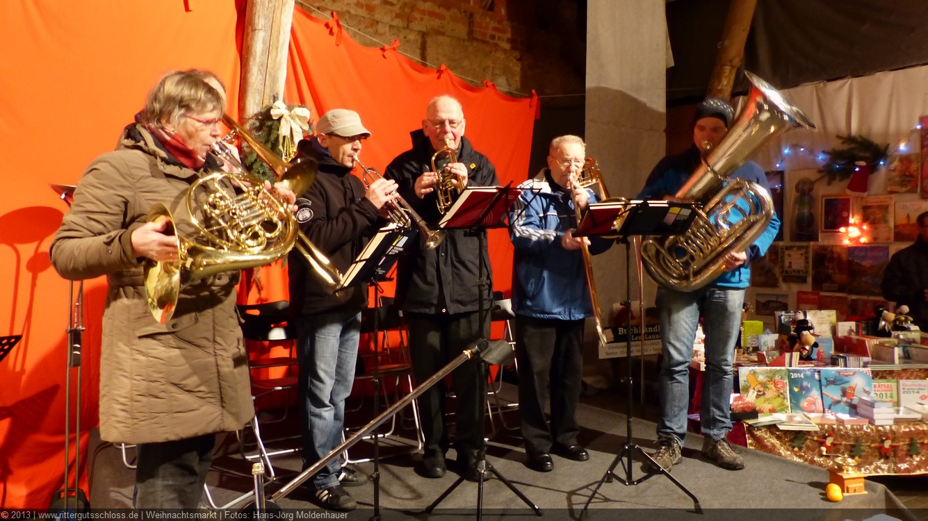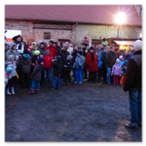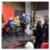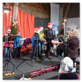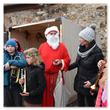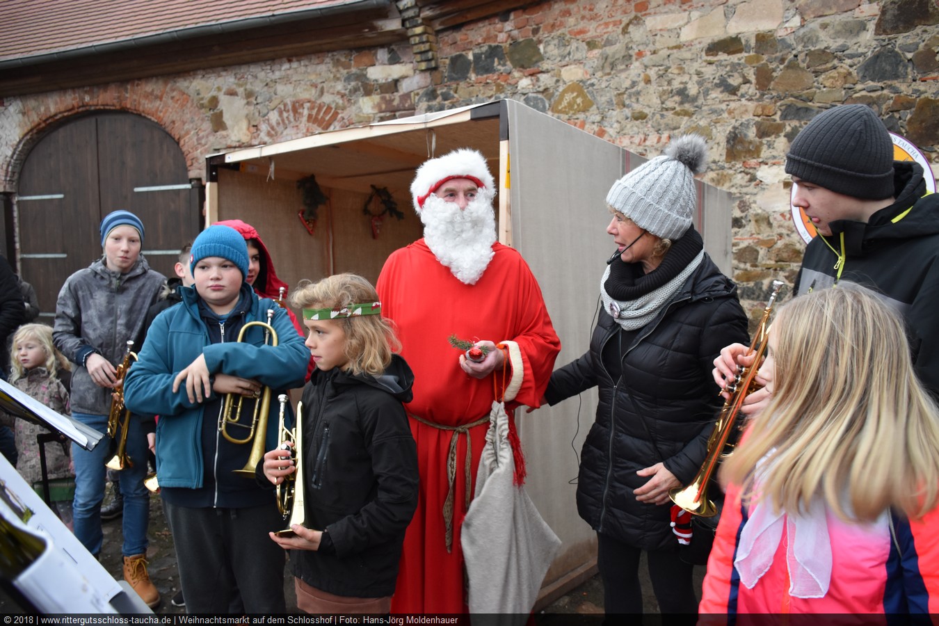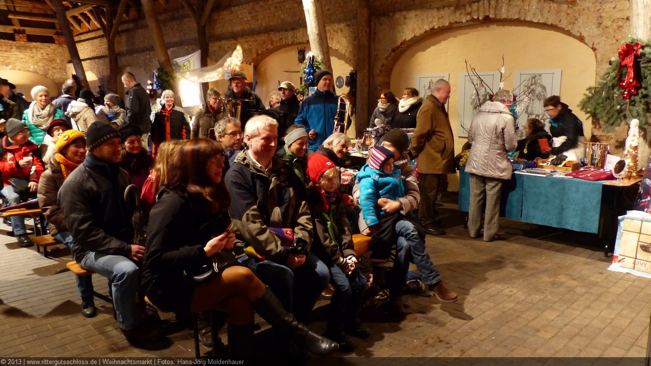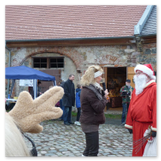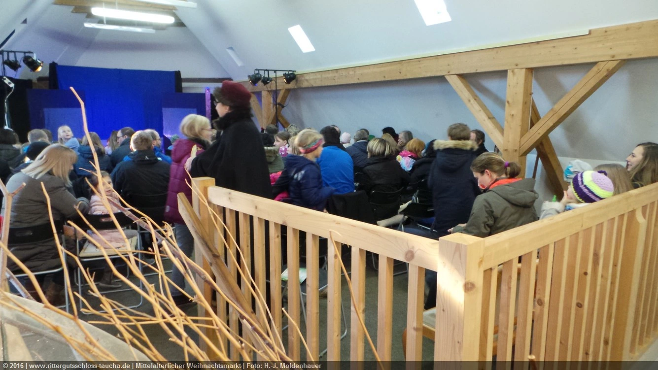 Die Zeit verging wie im Fluge, aber wir wollten unbedingt auch noch in die Weihnachts-scheune. Gleich beim Betreten war ich von der wunderbaren Dekoration beeindruckt. Die Liebe zum Detail, die freundliche Atmosphäre und die vielen Mitmach-Angebote für die Kinder – einfach toll! Da gab es kein „Abdudeln“ irgendwelcher Weihnachtsmusiken; hier wurde Stimmung live dargeboten. Begrüßt wurden wir vom Chor der Tauchaer Kirchgemeine; etwas später erklangen wunderbare weihnachtliche Melodien von Musikern der Kreismusikschule auf Trompeten, Posaunen und Hörnern.