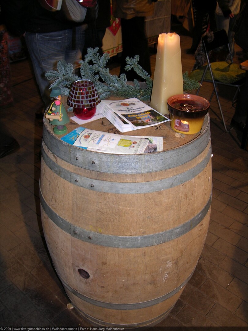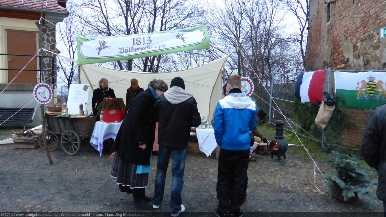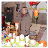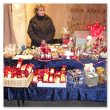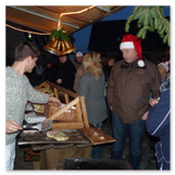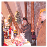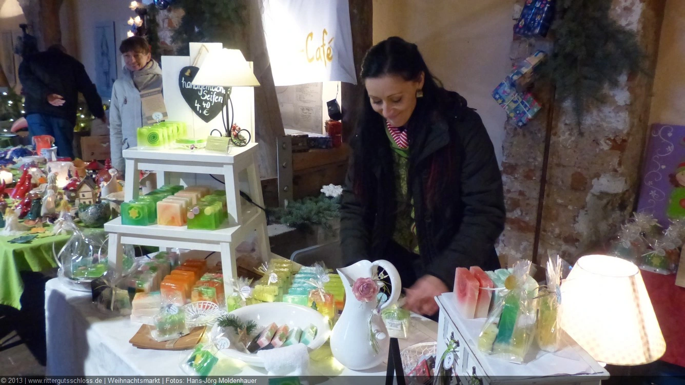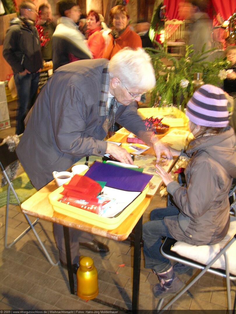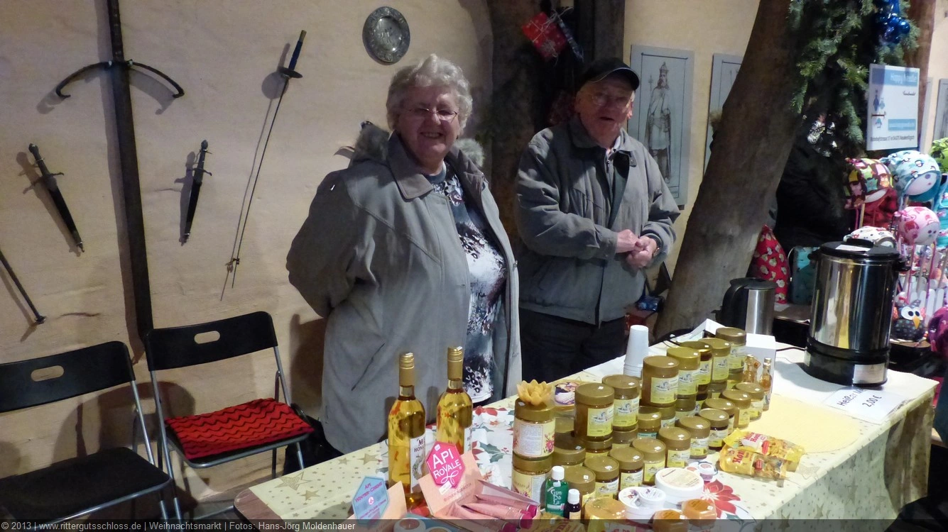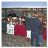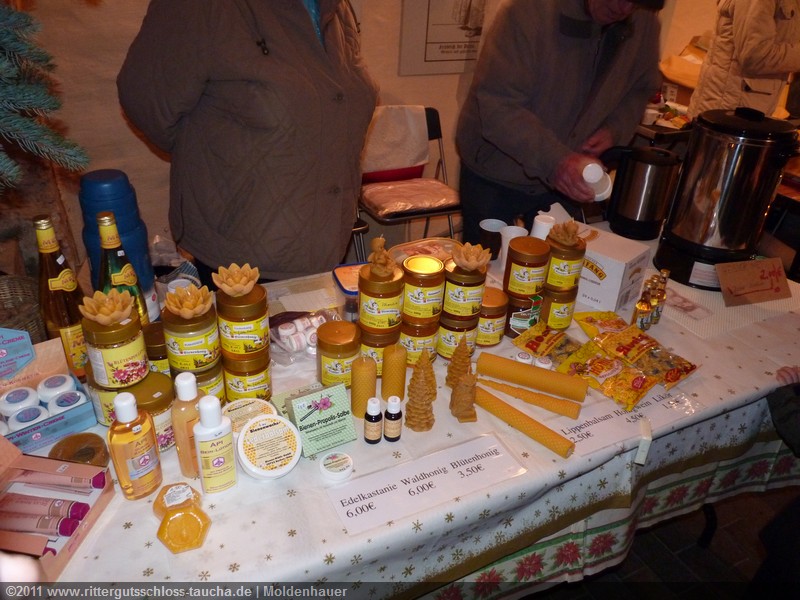 Weiter ging´s zum Bastelstand. Während meine Enkelin eine Meisenglocke für unsere gefiederten Wintergäste im Garten herstellte, schaute ich mich an den zahlreichen Ständen in der Scheune um. Etwas fiel mir sofort auf: Die Freundlichkeit der Händler. Ob Strickwaren für den Winter, leckerer Honig aus einheimischer Produktion, ob gebrannte Mandeln oder Fettbemmchen aus der Schlossküche, ob handgezogene Kerzen oder Holzspielzeug aus dem Erzgebirge – alles war ansprechend dekoriert und wurde nett angeboten.