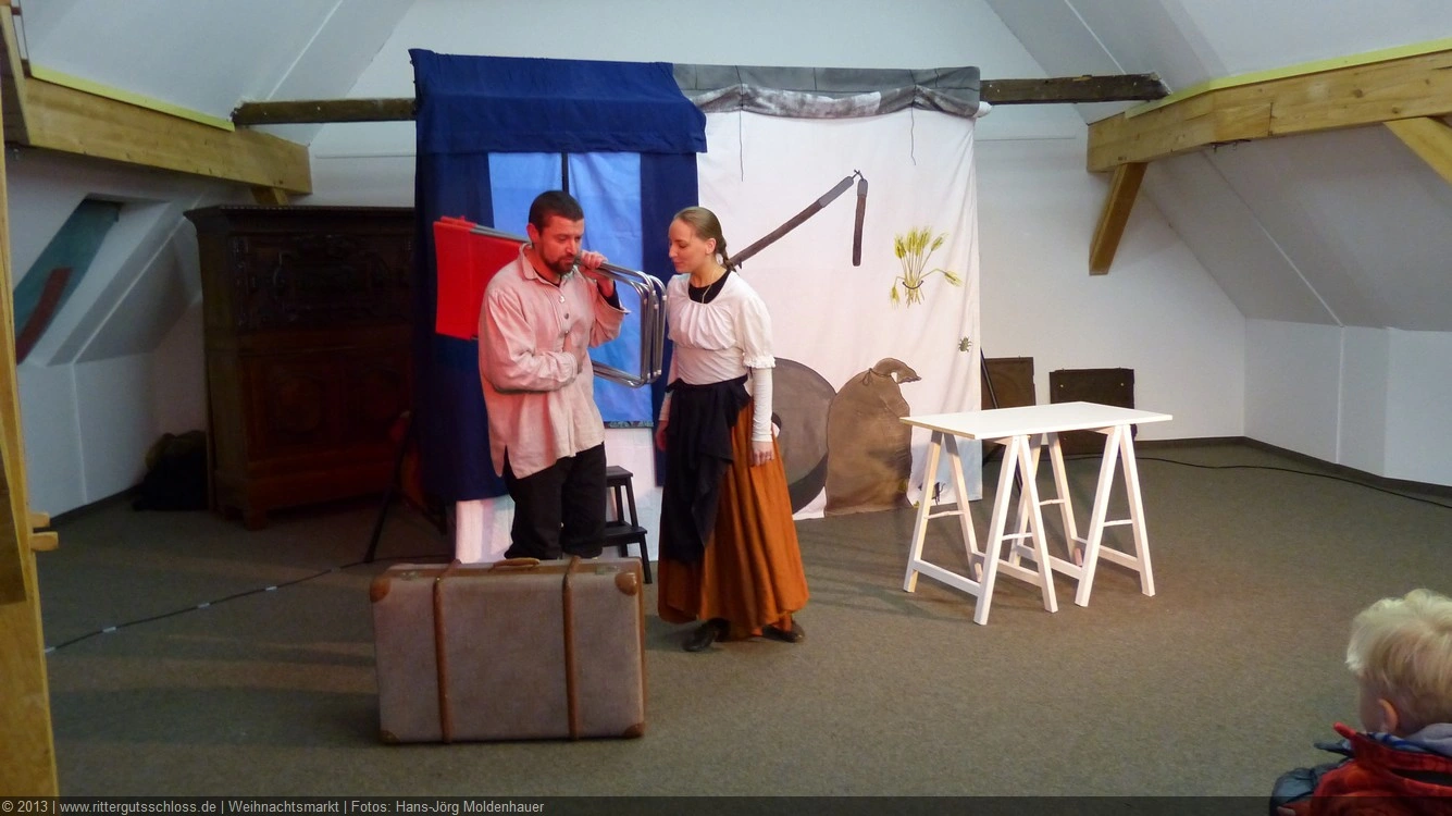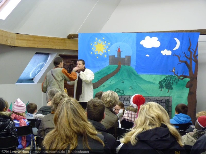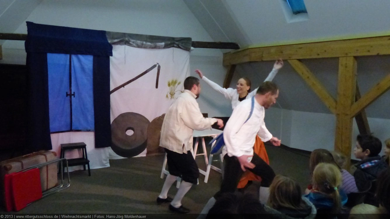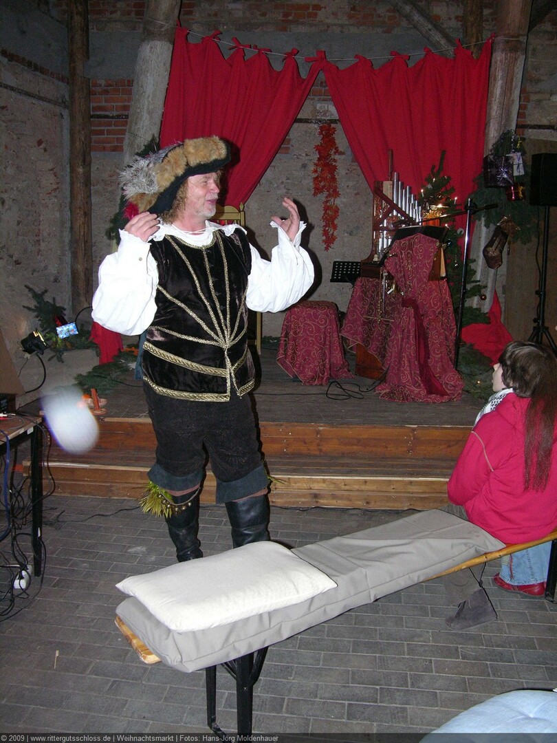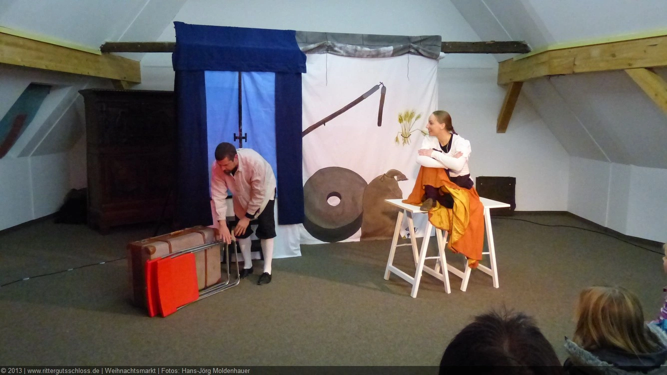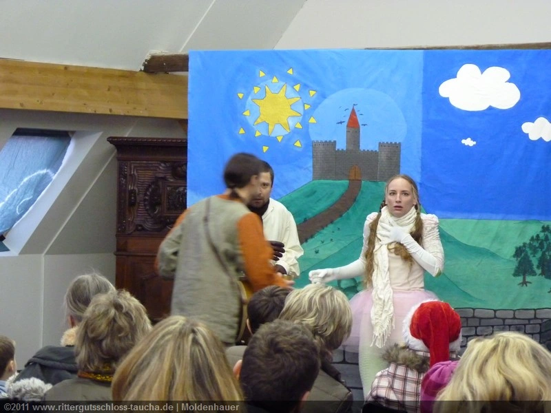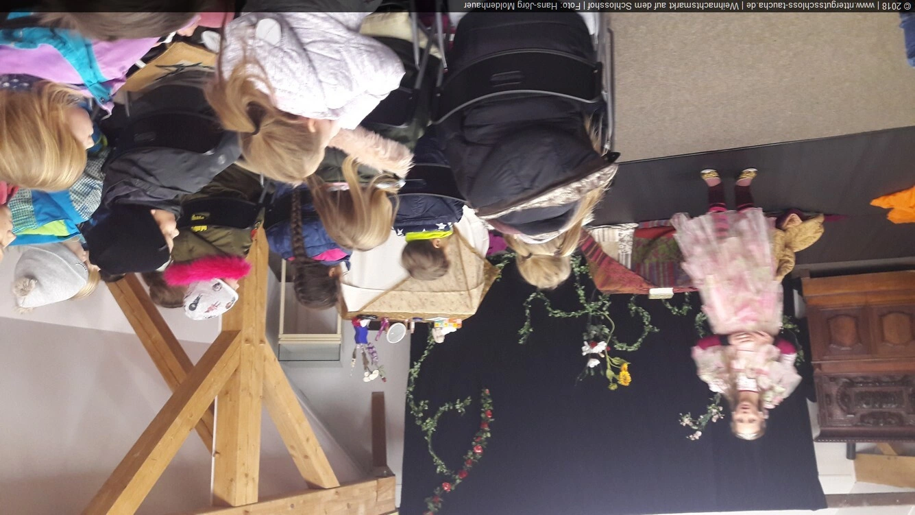 Als Gaukler Florenz den Hof betrat, bildete sich sofort eine Menschentraube um ihn. Ein grandioses Spektakel mit Zauberei, Artistik und Feuertricks begann – Marie staunte mit halboffenem Mund. Ganz wunderbar fand ich, dass der Gaukler nicht nur vorführte, sondern die Kinder in seine nette Schau gleich mit einbezog. Ich musste schließlich meine Enkelin fast wegziehen, denn schon begann eine andere Geschichte, die wir uns nicht entgehen lassen wollten. Wir stiegen eine etwas steile Treppe hinaus und betraten einen großen Raum – zum Bersten voll mit Kindern aller Altersgruppen. Kaum hatten wir noch ein Plätzchen gefunden begann auch schon das Märchenspiel von der „Prinzessin auf der Erbse“. Das kleine Schauspielerensemble beeindruckte vom ersten Moment an; die Kinder jubelten, sangen und spielten mit und befanden sich mitten im Märchenland.