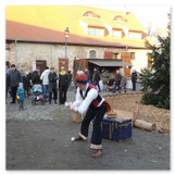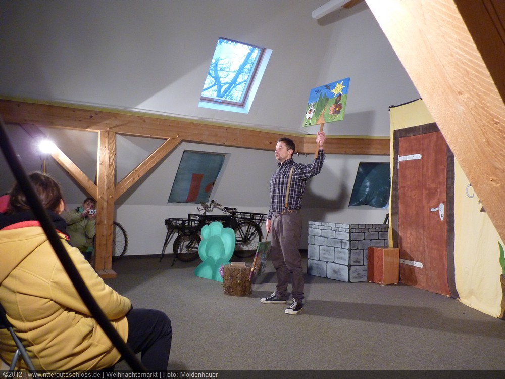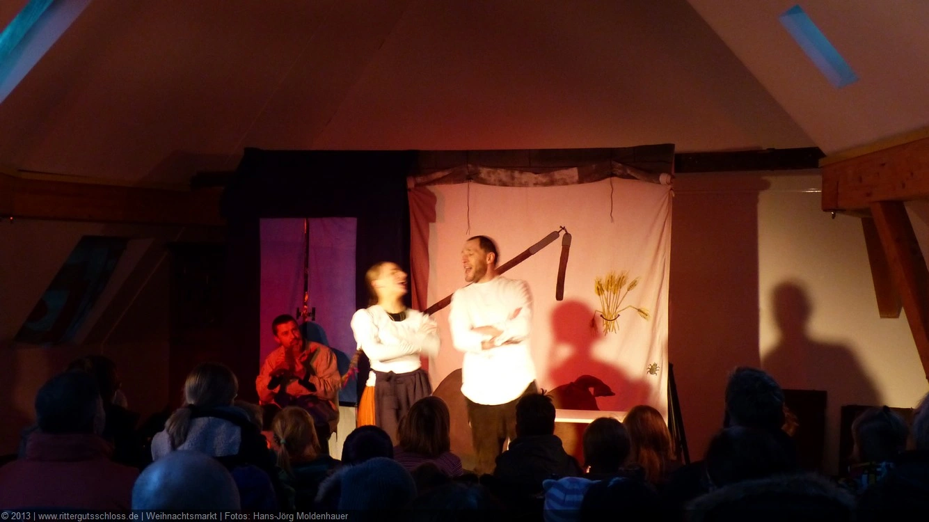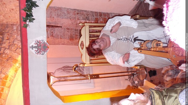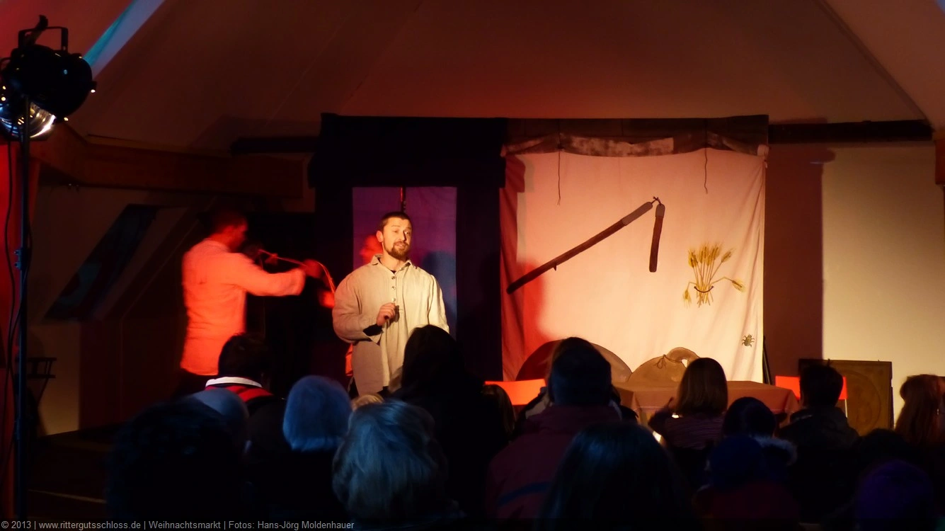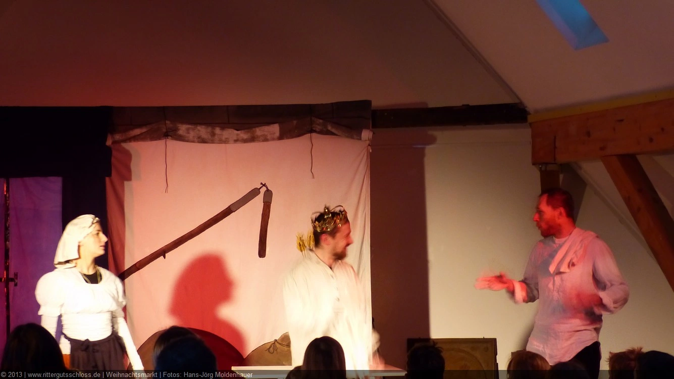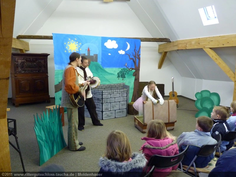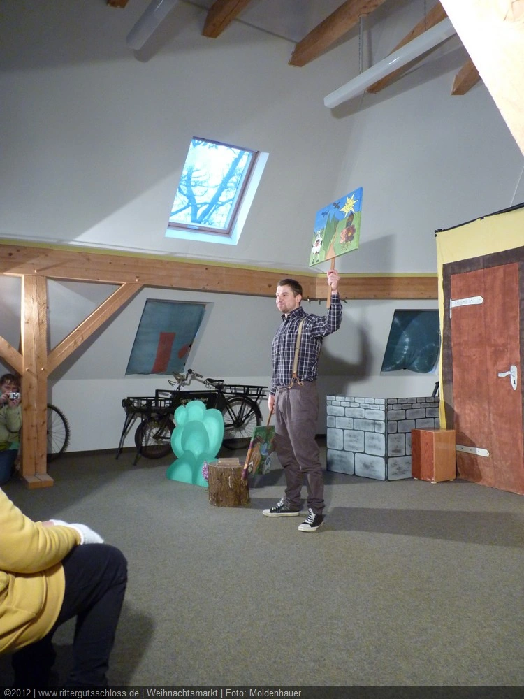 Als Gaukler Florenz den Hof betrat, bildete sich sofort eine Menschentraube um ihn. Ein grandioses Spektakel mit Zauberei, Artistik und Feuertricks begann – Marie staunte mit halboffenem Mund. Ganz wunderbar fand ich, dass der Gaukler nicht nur vorführte, sondern die Kinder in seine nette Schau gleich mit einbezog. Ich musste schließlich meine Enkelin fast wegziehen, denn schon begann eine andere Geschichte, die wir uns nicht entgehen lassen wollten. Wir stiegen eine etwas steile Treppe hinaus und betraten einen großen Raum – zum Bersten voll mit Kindern aller Altersgruppen. Kaum hatten wir noch ein Plätzchen gefunden begann auch schon das Märchenspiel von der „Prinzessin auf der Erbse“. Das kleine Schauspielerensemble beeindruckte vom ersten Moment an; die Kinder jubelten, sangen und spielten mit und befanden sich mitten im Märchenland.