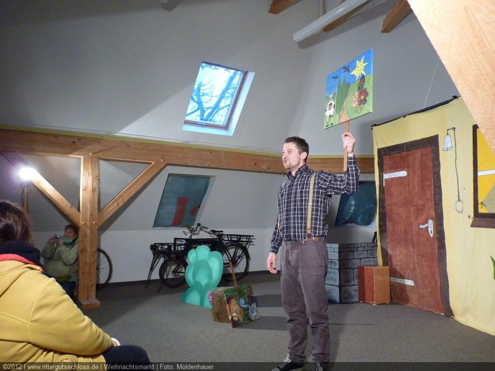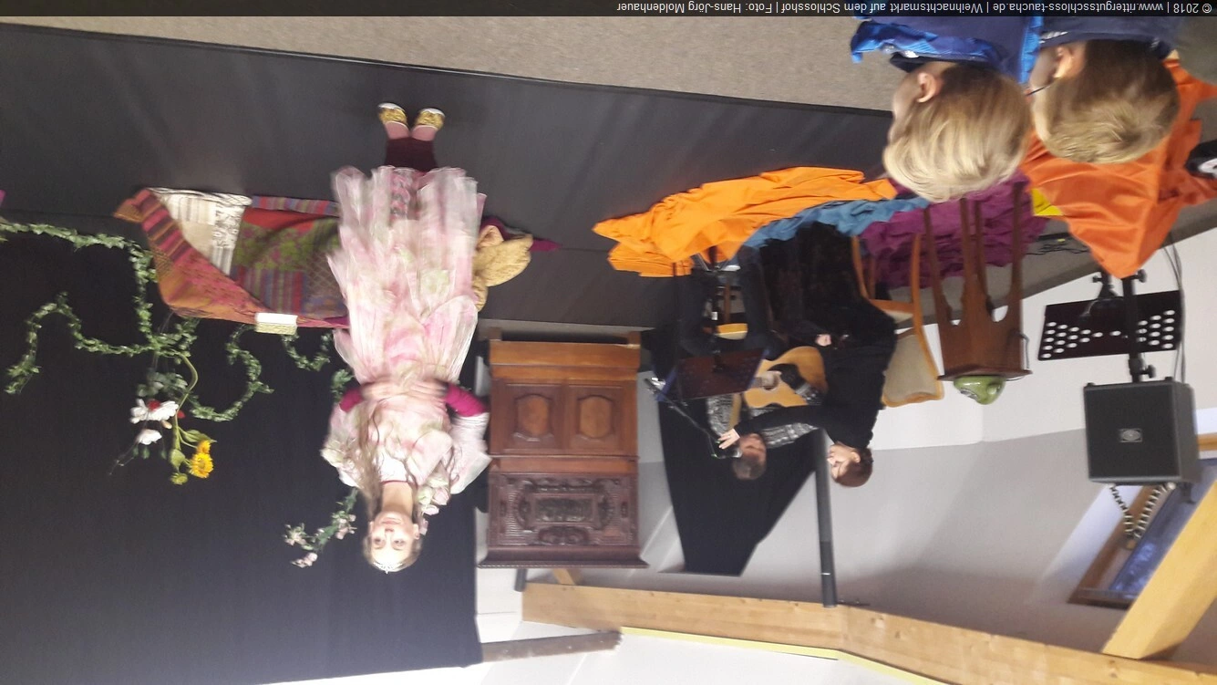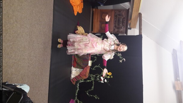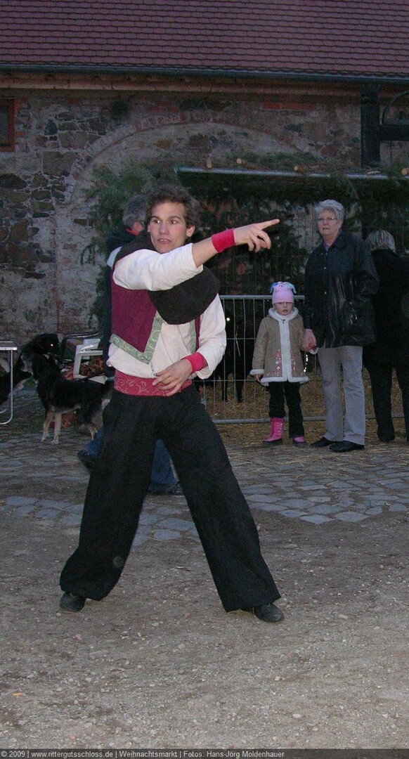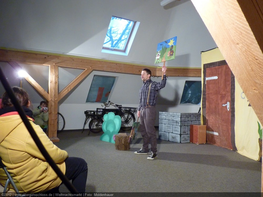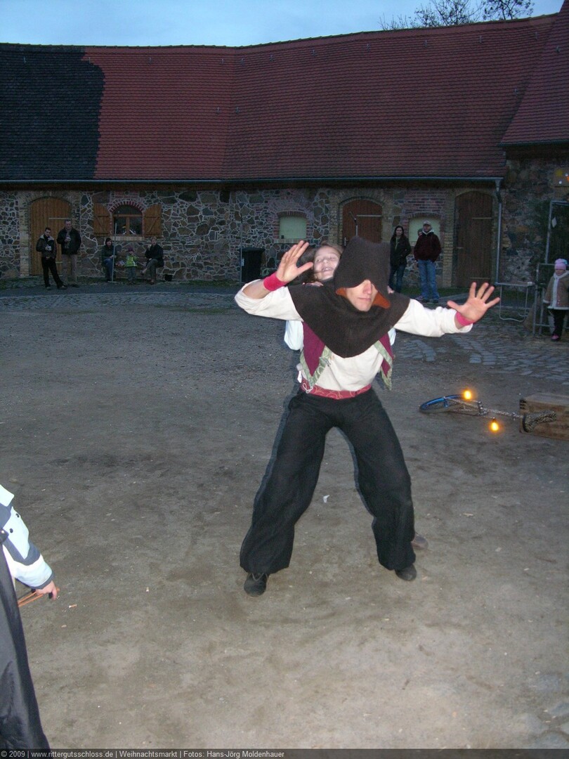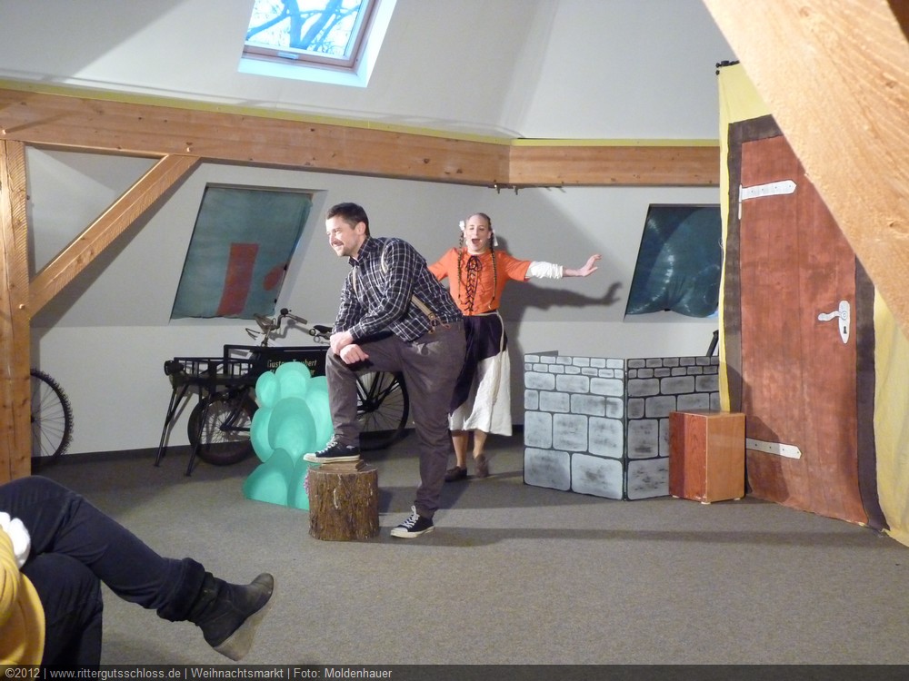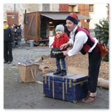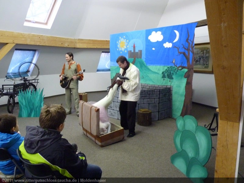 Als Gaukler Florenz den Hof betrat, bildete sich sofort eine Menschentraube um ihn. Ein grandioses Spektakel mit Zauberei, Artistik und Feuertricks begann – Marie staunte mit halboffenem Mund. Ganz wunderbar fand ich, dass der Gaukler nicht nur vorführte, sondern die Kinder in seine nette Schau gleich mit einbezog. Ich musste schließlich meine Enkelin fast wegziehen, denn schon begann eine andere Geschichte, die wir uns nicht entgehen lassen wollten. Wir stiegen eine etwas steile Treppe hinaus und betraten einen großen Raum – zum Bersten voll mit Kindern aller Altersgruppen. Kaum hatten wir noch ein Plätzchen gefunden begann auch schon das Märchenspiel von der „Prinzessin auf der Erbse“. Das kleine Schauspielerensemble beeindruckte vom ersten Moment an; die Kinder jubelten, sangen und spielten mit und befanden sich mitten im Märchenland.