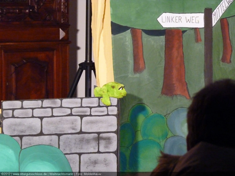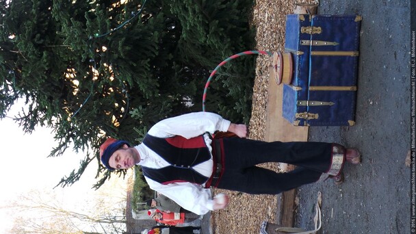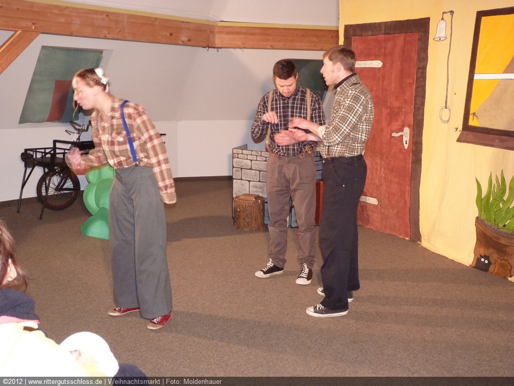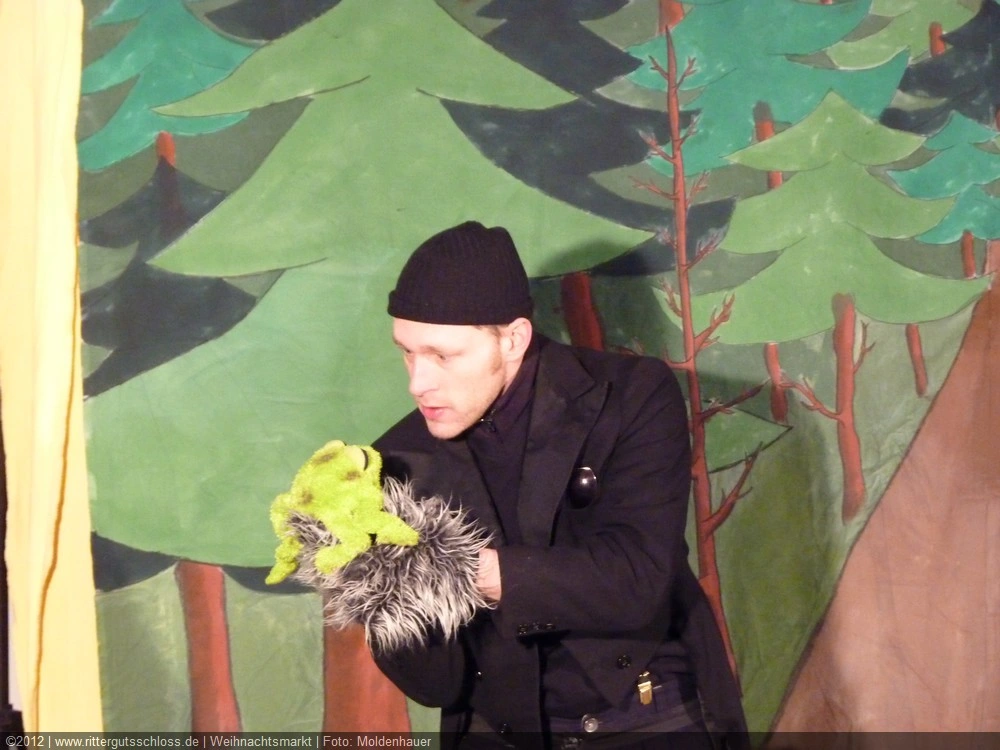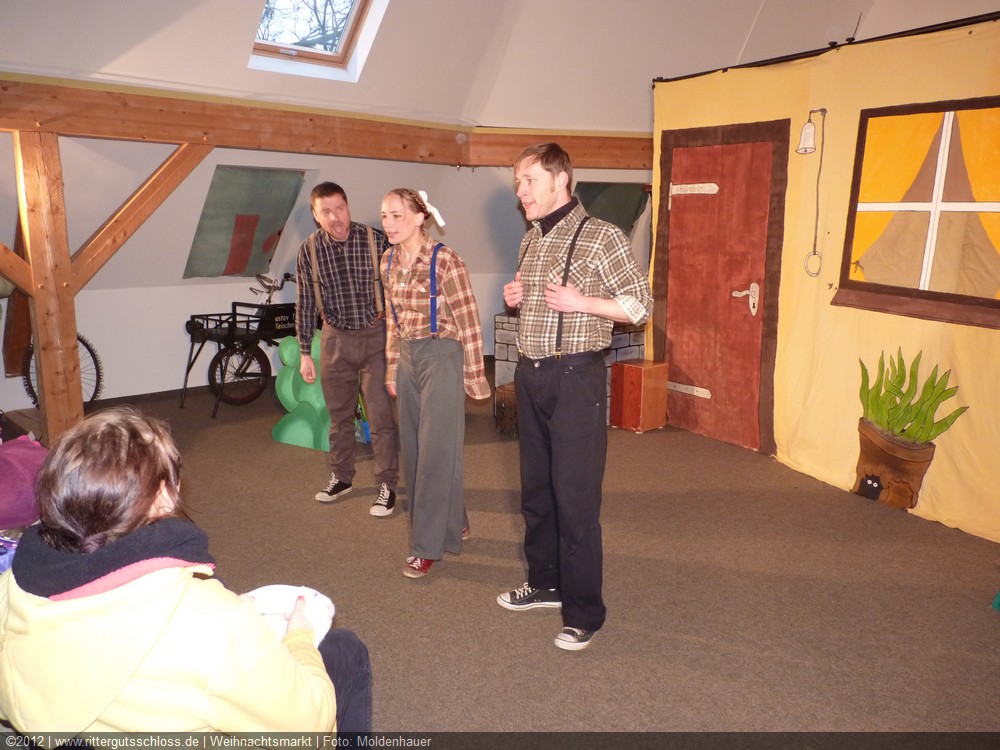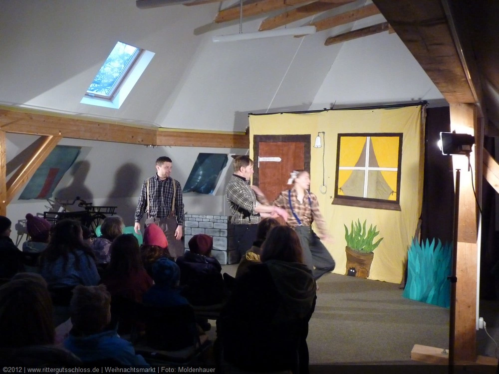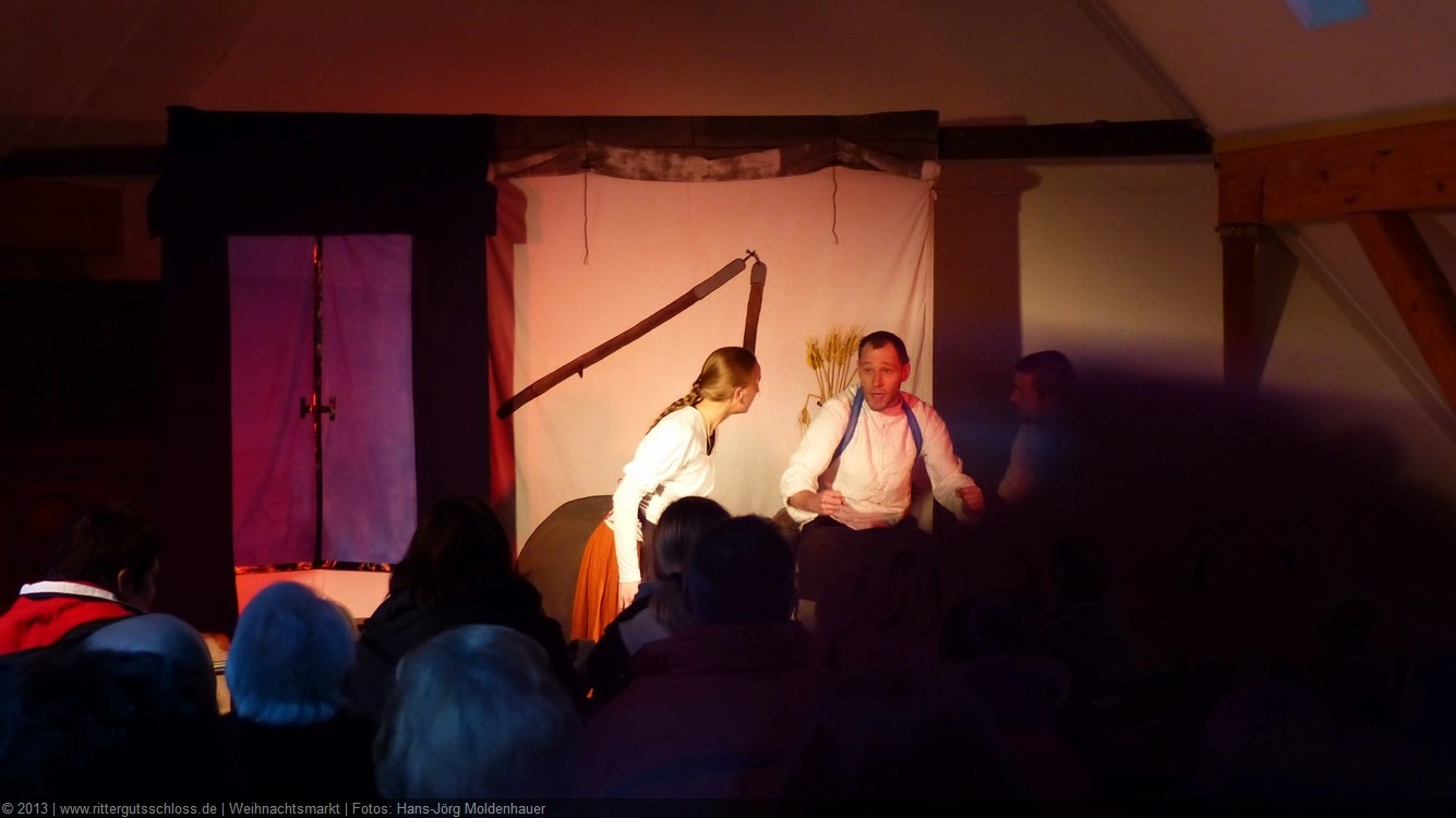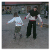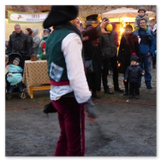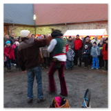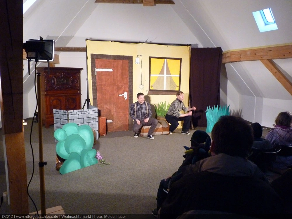 Als Gaukler Florenz den Hof betrat, bildete sich sofort eine Menschentraube um ihn. Ein grandioses Spektakel mit Zauberei, Artistik und Feuertricks begann – Marie staunte mit halboffenem Mund. Ganz wunderbar fand ich, dass der Gaukler nicht nur vorführte, sondern die Kinder in seine nette Schau gleich mit einbezog. Ich musste schließlich meine Enkelin fast wegziehen, denn schon begann eine andere Geschichte, die wir uns nicht entgehen lassen wollten. Wir stiegen eine etwas steile Treppe hinaus und betraten einen großen Raum – zum Bersten voll mit Kindern aller Altersgruppen. Kaum hatten wir noch ein Plätzchen gefunden begann auch schon das Märchenspiel von der „Prinzessin auf der Erbse“. Das kleine Schauspielerensemble beeindruckte vom ersten Moment an; die Kinder jubelten, sangen und spielten mit und befanden sich mitten im Märchenland.