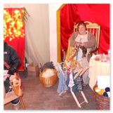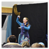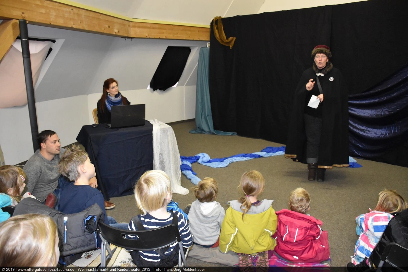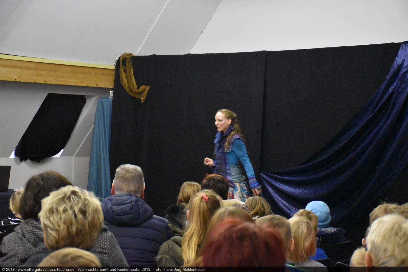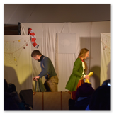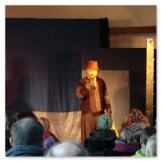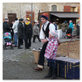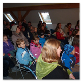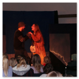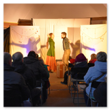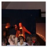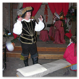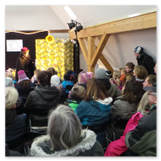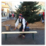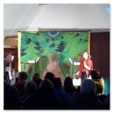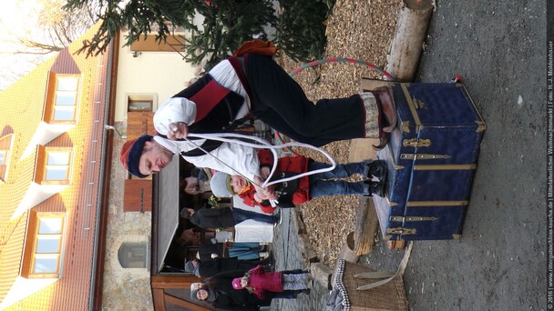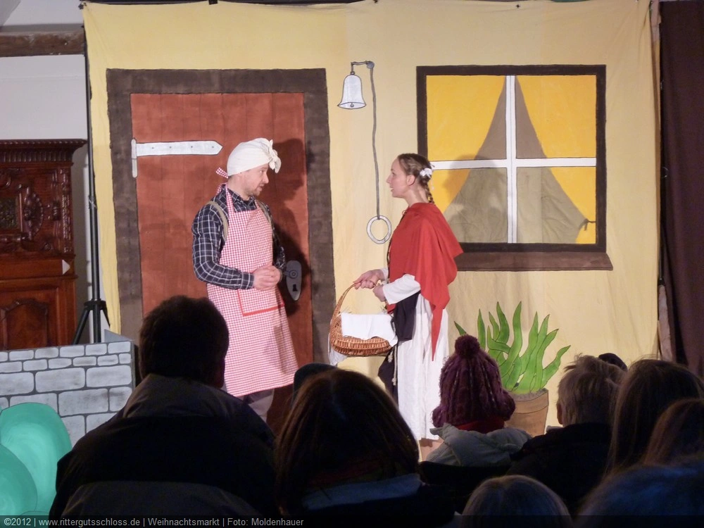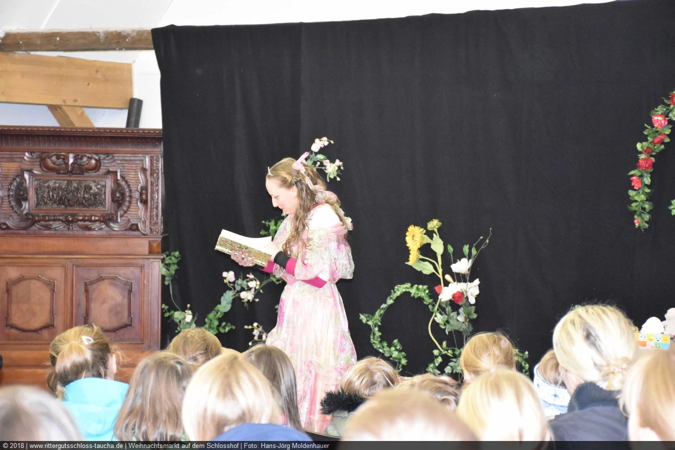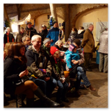 Als Gaukler Florenz den Hof betrat, bildete sich sofort eine Menschentraube um ihn. Ein grandioses Spektakel mit Zauberei, Artistik und Feuertricks begann – Marie staunte mit halboffenem Mund. Ganz wunderbar fand ich, dass der Gaukler nicht nur vorführte, sondern die Kinder in seine nette Schau gleich mit einbezog. Ich musste schließlich meine Enkelin fast wegziehen, denn schon begann eine andere Geschichte, die wir uns nicht entgehen lassen wollten. Wir stiegen eine etwas steile Treppe hinaus und betraten einen großen Raum – zum Bersten voll mit Kindern aller Altersgruppen. Kaum hatten wir noch ein Plätzchen gefunden begann auch schon das Märchenspiel von der „Prinzessin auf der Erbse“. Das kleine Schauspielerensemble beeindruckte vom ersten Moment an; die Kinder jubelten, sangen und spielten mit und befanden sich mitten im Märchenland.