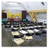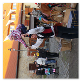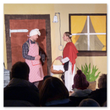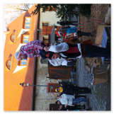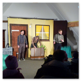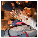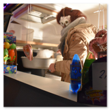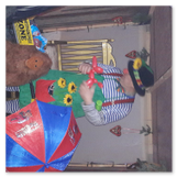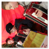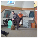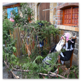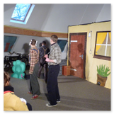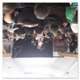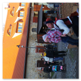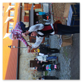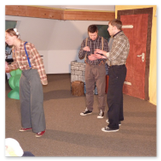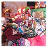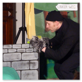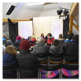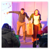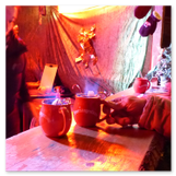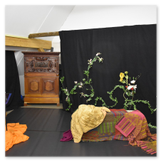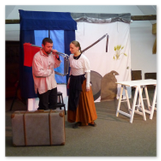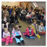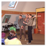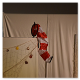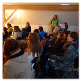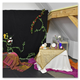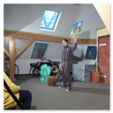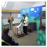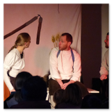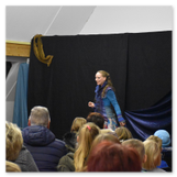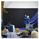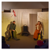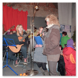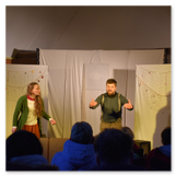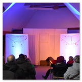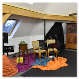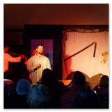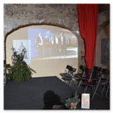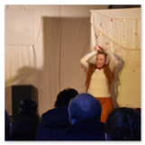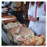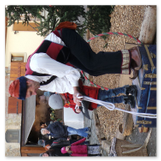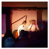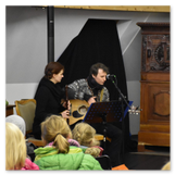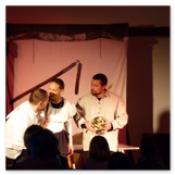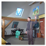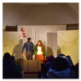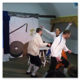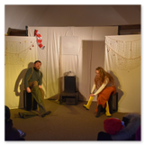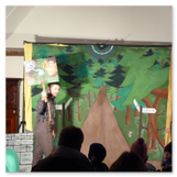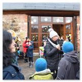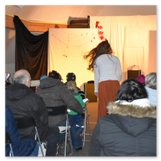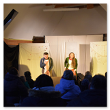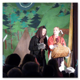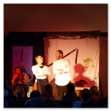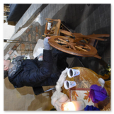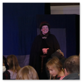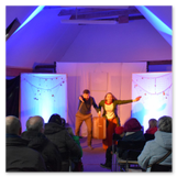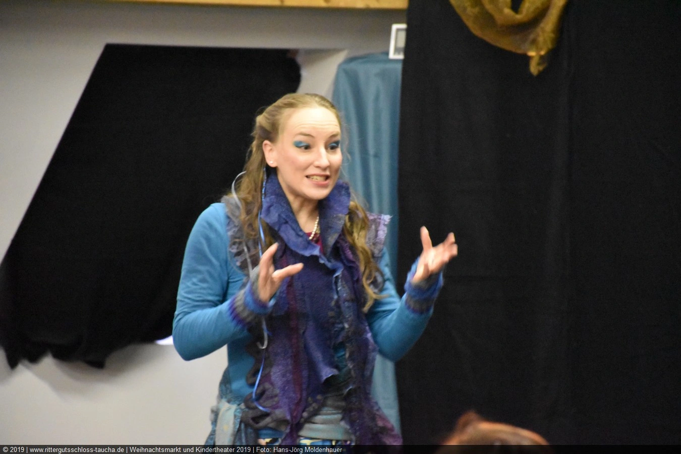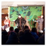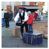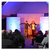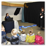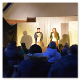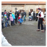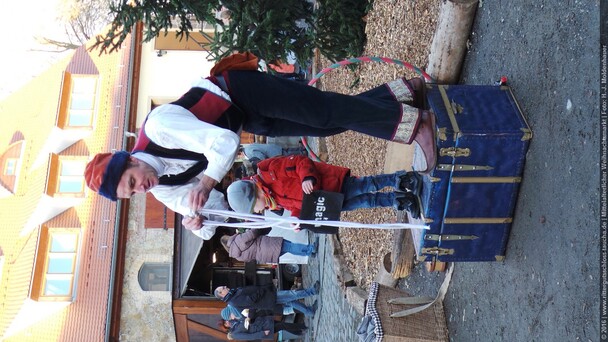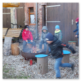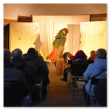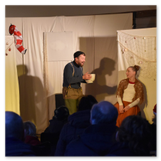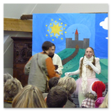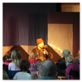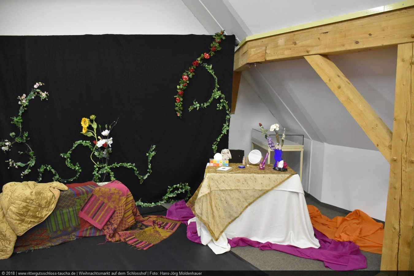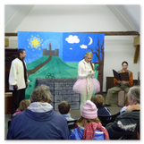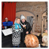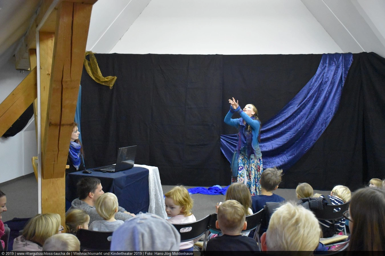 Als Gaukler Florenz den Hof betrat, bildete sich sofort eine Menschentraube um ihn. Ein grandioses Spektakel mit Zauberei, Artistik und Feuertricks begann – Marie staunte mit halboffenem Mund. Ganz wunderbar fand ich, dass der Gaukler nicht nur vorführte, sondern die Kinder in seine nette Schau gleich mit einbezog. Ich musste schließlich meine Enkelin fast wegziehen, denn schon begann eine andere Geschichte, die wir uns nicht entgehen lassen wollten. Wir stiegen eine etwas steile Treppe hinaus und betraten einen großen Raum – zum Bersten voll mit Kindern aller Altersgruppen. Kaum hatten wir noch ein Plätzchen gefunden begann auch schon das Märchenspiel von der „Prinzessin auf der Erbse“. Das kleine Schauspielerensemble beeindruckte vom ersten Moment an; die Kinder jubelten, sangen und spielten mit und befanden sich mitten im Märchenland.