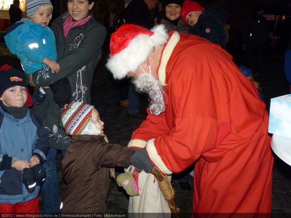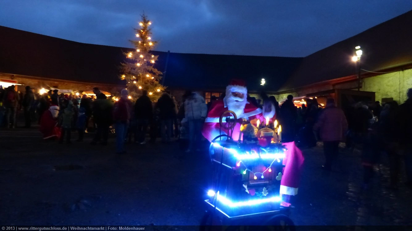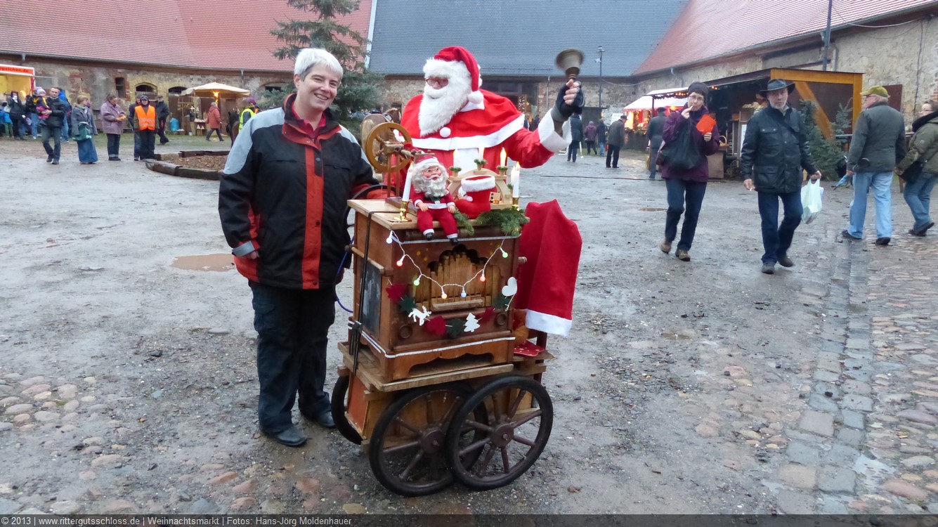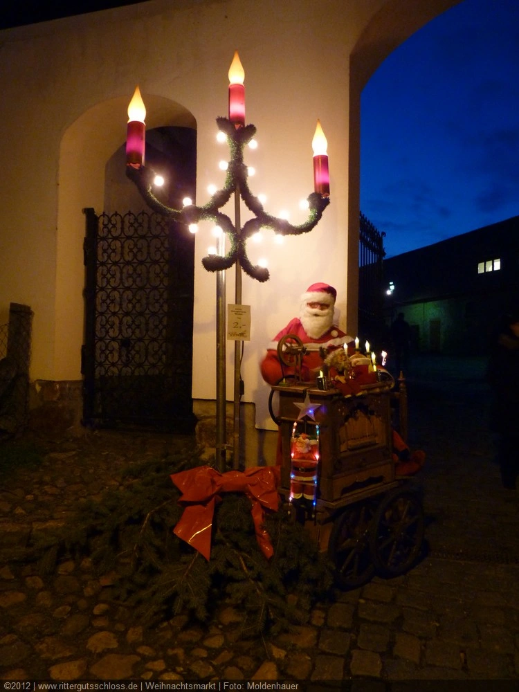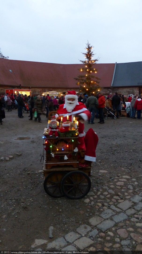 Meine Enkelin war schon ganz aufgeregt, je näher wir dem Schloss kamen. Am prächtigen Schlosstor wurden wir von einem leierkastenspielenden Weihnachtsmann freundlich begrüßt. Der Schlosshof war weihnachtlich geschmückt, aber nicht so überladen wie auf vielen anderen Weihnachtsmärkten.