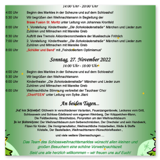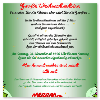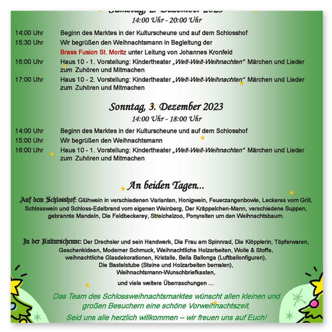 Von Beginn der Aktivitäten des Schlossvereins an zählte natürlich der Weihnachtsmarkt zu den großen traditionellen Terminen im Jahreskalender. Es ist das Fest der Familie und Kinder. Diese in das Geschehen um Schloss und Schlossberg und später ins Vereinsgeschehen einzubinden, ist ein wichtiger Baustein im Vereinsleben.
